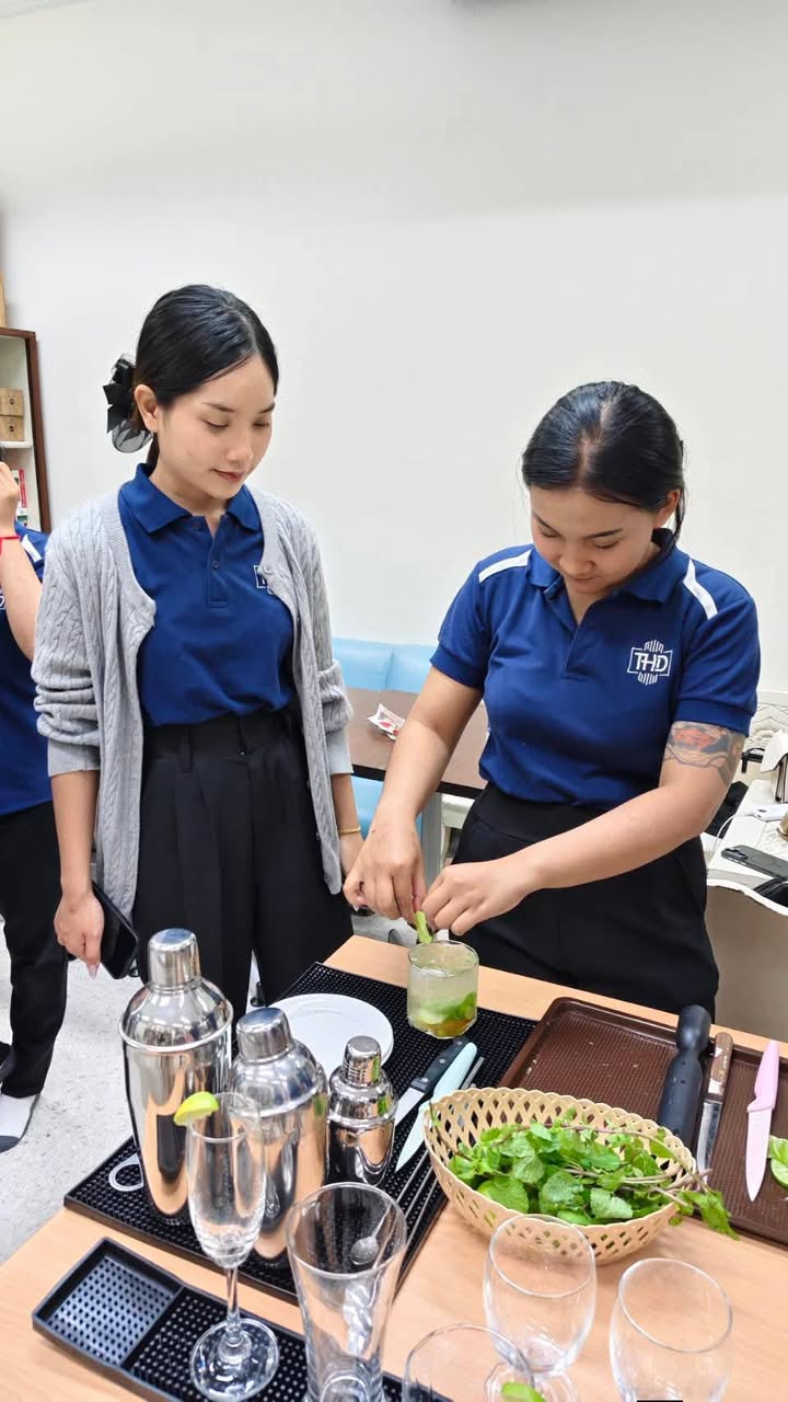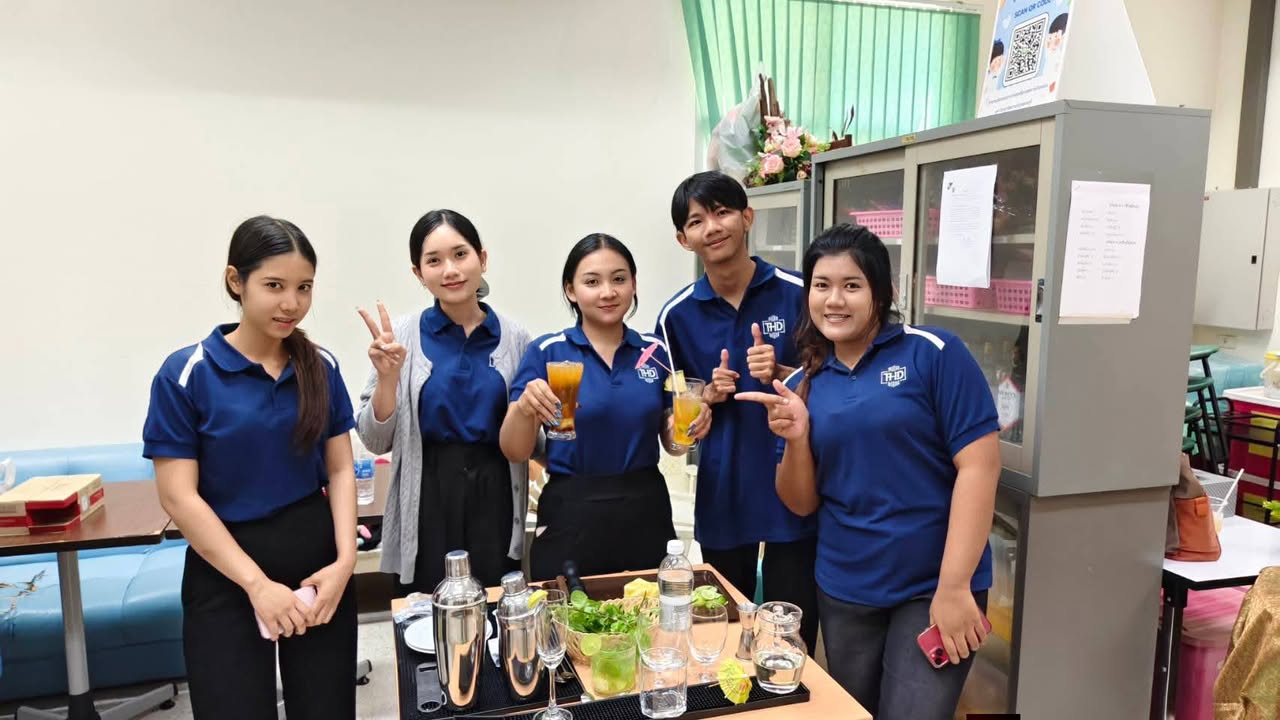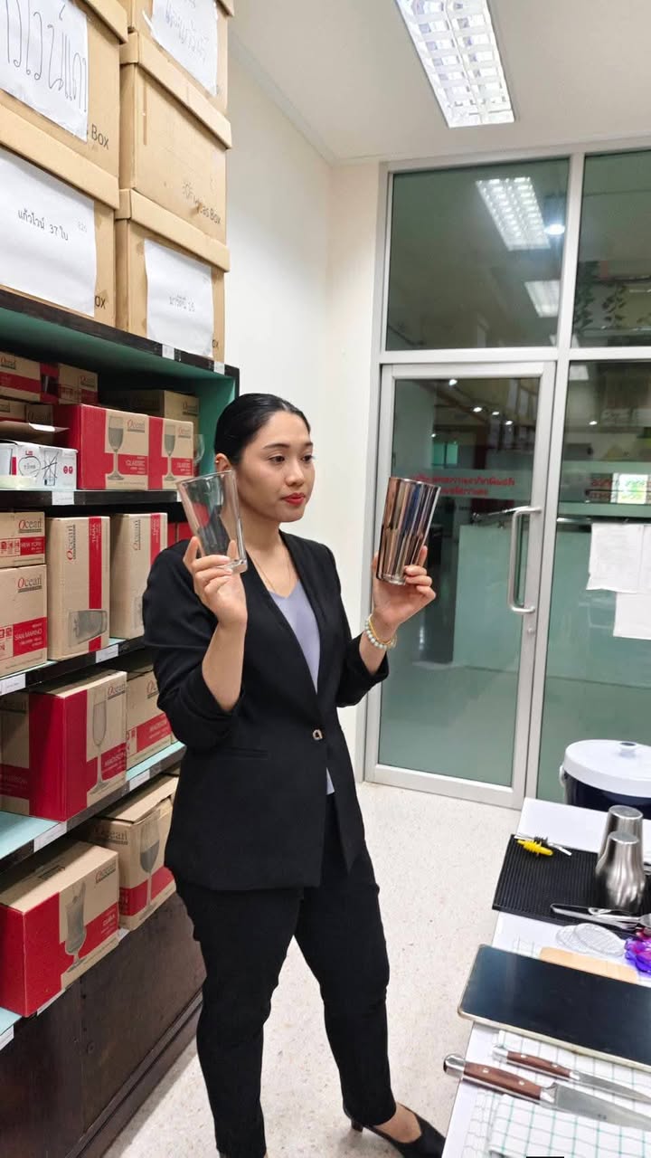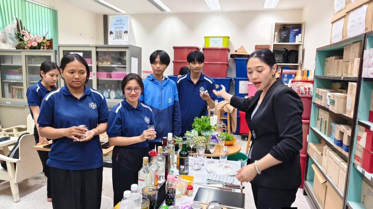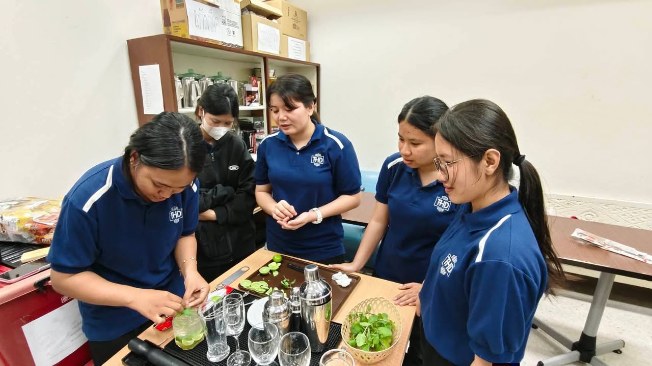 นอกจากนี้ยังได้ฝึกปฏิบัติการผสมเครื่องดื่ม ทั้งในรูปแบบ Mocktail และ Cocktail โดยนักศึกษาได้ทดลองสร้างสรรค์เมนูเครื่องดื่ม เช่น