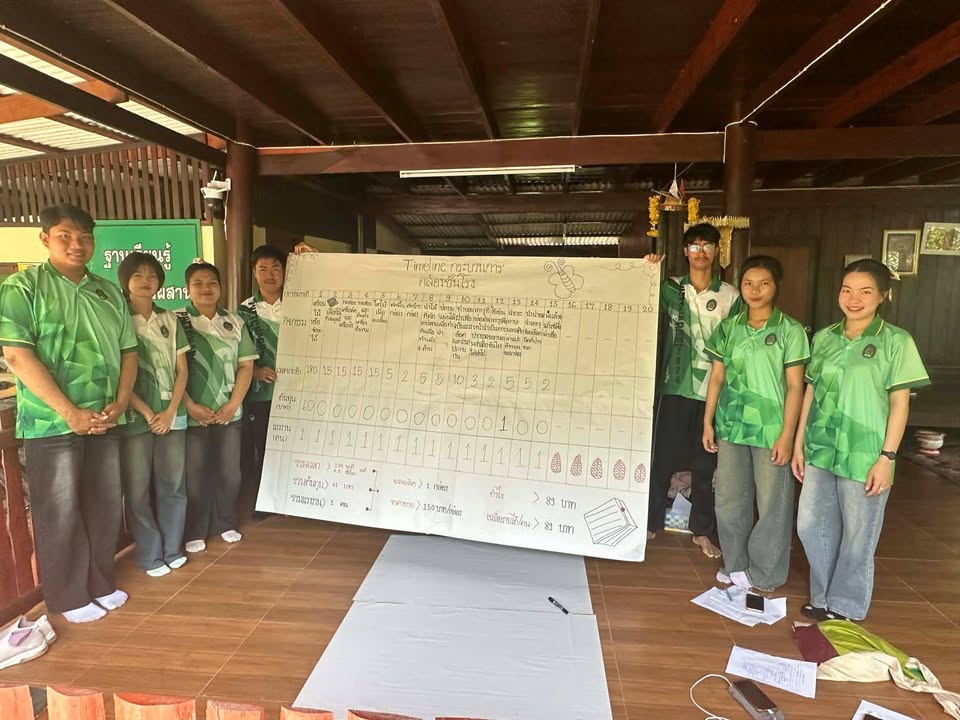 ในการลงพื้นที่ครั้งนี้ นักศึกษาได้ร่วมพูดคุยแลกเปลี่ยนกับสมาชิกกลุ่มผู้เลี้ยงชันโรงผ่านเครื่องมือ Timeline พัฒนาการ และนักศึกษายังได้ใช้เครื่องมือ Timeline กระบวนการ เพื่อร่วมกันวิเคราะห์กระบวนการทำกล่องเลี้ยงชันโรง และนำไปสู่การใช้เครื่องมือ M.I.C. Model ต่อไป