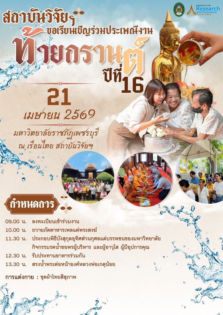 สถาบันวิจัยและส่งเสริมศิลปวัฒนธรรม ขอเชิญคณะผู้บริหาร คณาจารย์ และบุคลากร ✨ร่วมสืบสานประเพณี “ท้ายสงกรานต์” ปีที่ 16 เพื่อความเป็นสิริมงคลและร่วมรักษามรดกทางวัฒนธรรมอันดีงามของไทย 16 เมษายน 202616 เมษายน 2026no-Systemข่าวสื่อสารองค์กร จำนวนผู้ชม : 3 📣สถาบันวิจัยและส่งเสริมศิลปวัฒนธรรม ขอเชิญคณะผู้บริหาร คณาจารย์ และบุคลากร✨ร่วมสืบสานประเพณี “ท้ายสงกรานต์” ปีที่ 16 เพื่อความเป็นสิริมงคลและร่วมรักษามรดกทางวัฒนธรรมอันดีงามของไทย✨✨✨📅 วันอังคารที่ 21 เมษายน 2569📍 ณ เรือนไทย สถาบันวิจัยฯ มหาวิทยาลัยราชภัฏเพชรบุรี👗 การแต่งกาย : ชุดผ้าไทยสุภาพ Facebook iconFacebookTwitter iconTwitterLINE iconLine