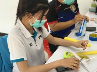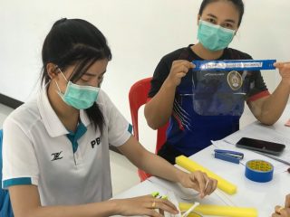 ผู้ช่วยศาสตราจารย์ ดร.เสนาะ กลิ่นงาม อธิการบดีมหาวิทยาลัยราชภัฎเพชรบุรี ร่วมผลิตและสาธิตการใช้หน้ากากป้องกันใบหน้า (face shield)