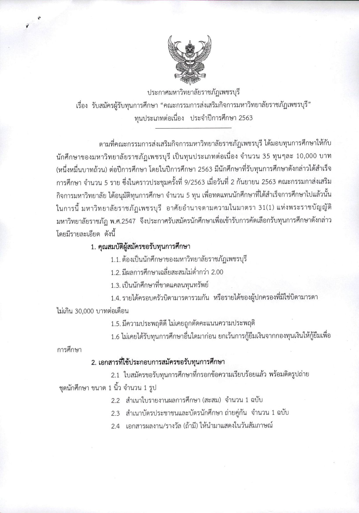 เปิดรับสมัครผู้รับทุนการศึกษา คณะกรรมการส่งเสริมกิจการมหาวิทยาลัยราชภัฏเพชรบุรี