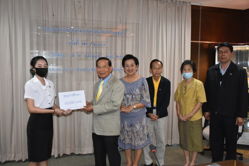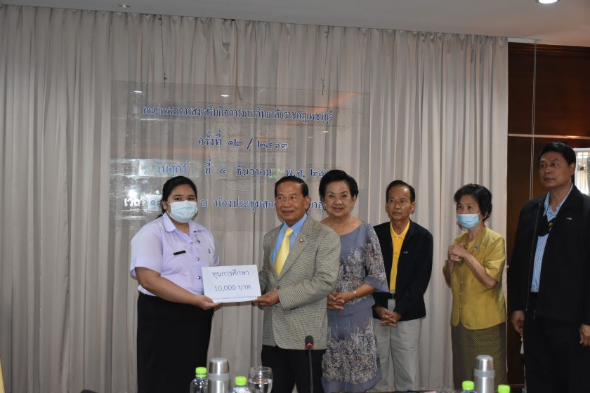เมื่อวันที่ 4 ธันวาคม 2563 ห้องประชุมราชภัฏสภา ชั้น 9 อาคารวิทยาภิรมย์ มหาวิทยาลัยราชภัฏเพชรบุรี พลเอกสุรินทร์ พิกุลทอง ประธานคณะกรรมการส่งเสริมกิจการมหาวิทยาลัยราชภัฏเพชรบุรี พร้อมด้วยคณะกรรมการส่งเสริมฯ มอบทุนการศึกษาประเภททุนการศึกษาต่อเนื่อง ประจำปีการศึกษา 2563 เพื่อทดแทนนักศึกษาที่ได้รับทุนการศึกษาซึ่งสำเร็จการศึกษาในปีการศึกษา 2562 จำนวน 5 ราย