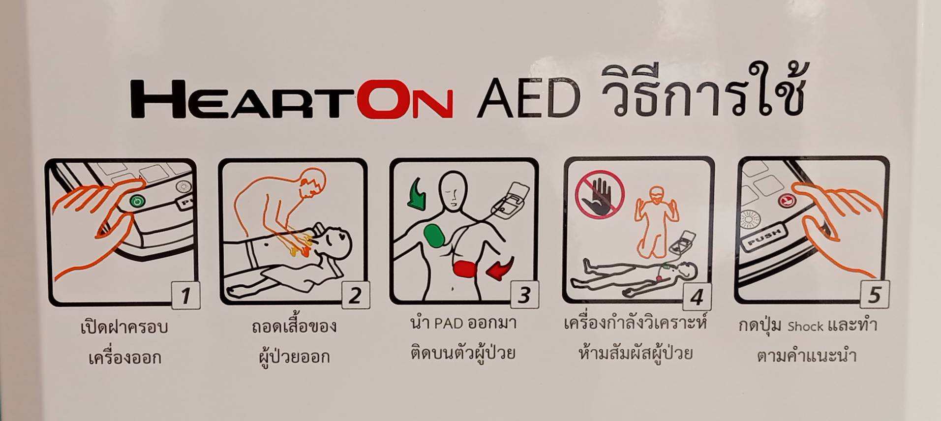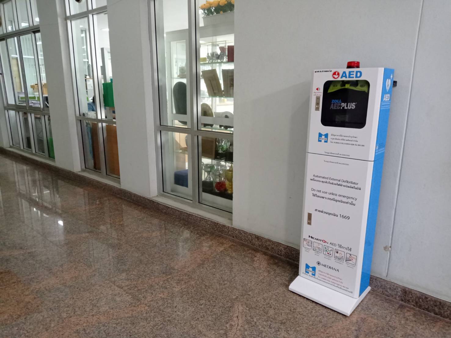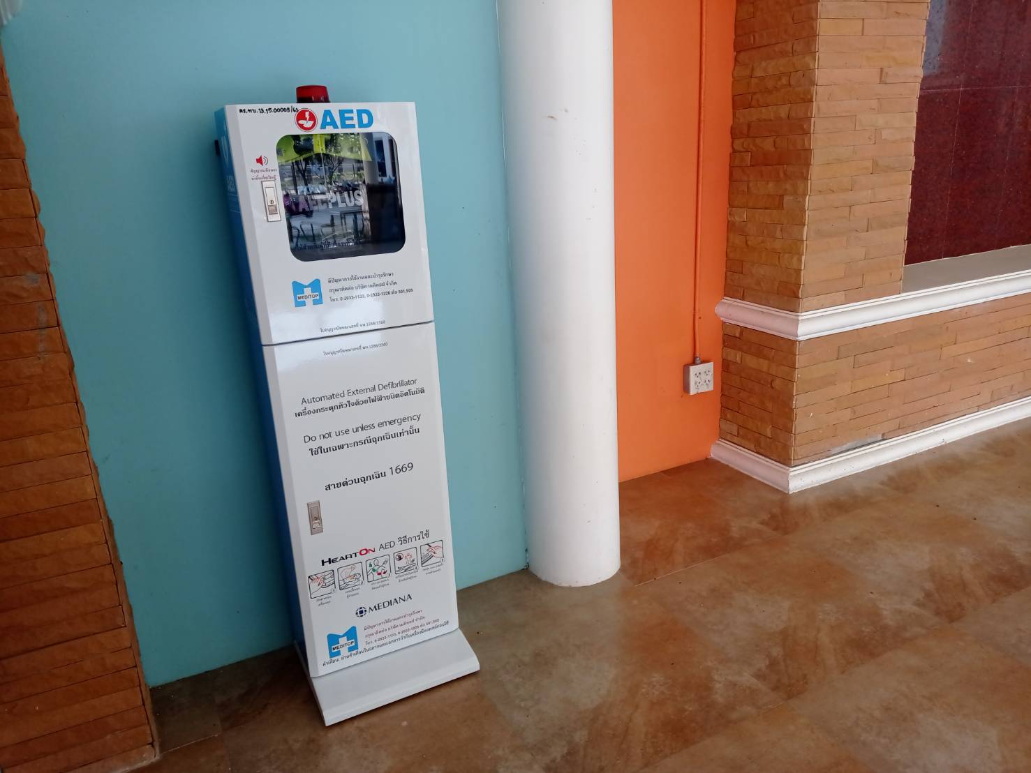 สำหรับ AED เป็นอุปกรณ์อิเล็กทรอนิกส์แบบพกพาที่ใช้ในผู้ป่วยหมดสติด้วยการใช้กระแสไฟฟ้า เป็นอุปกรณ์ที่สามารถใช้ปฐมพยาบาลช่วยเหลือผู้ป่วยฉุกเฉินได้อย่างมีประสิทธิภาพก่อนนำส่งโรงพยาบาล โดยผู้ที่ช่วยเหลือสามารถทำตามคำแนะนำของเครื่อง AED ซึ่งสามารถประเมินสถานการณ์ของผู้ป่วยได้อัตโนมัติ และช่วยกระตุ้นการทำงานของหัวใจได้อย่างทันท่วงที