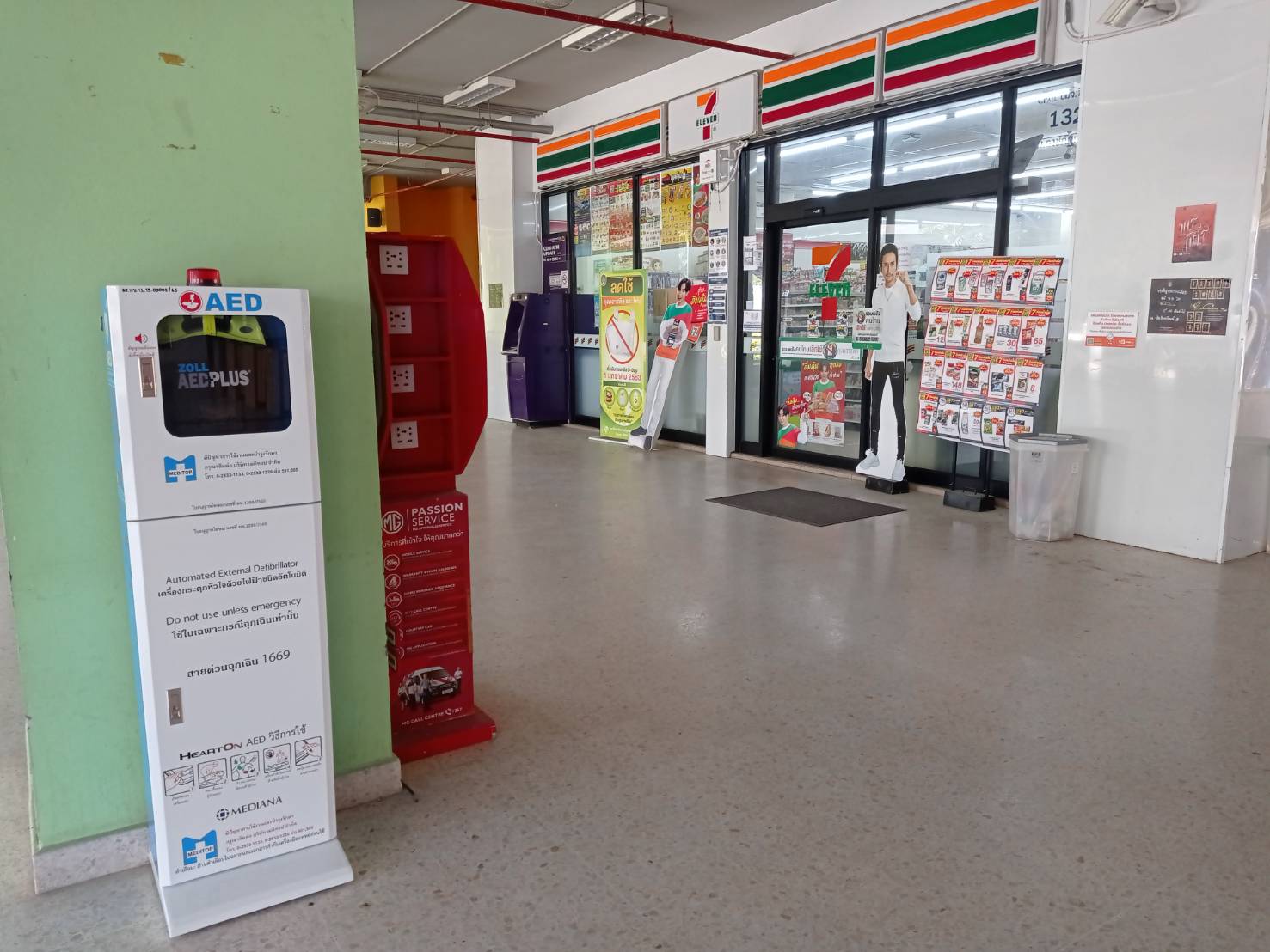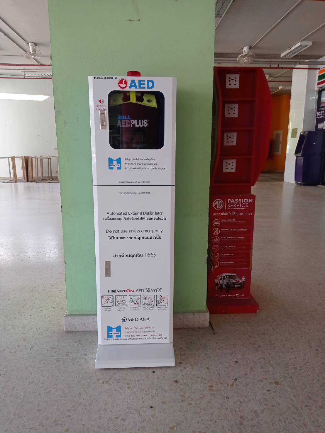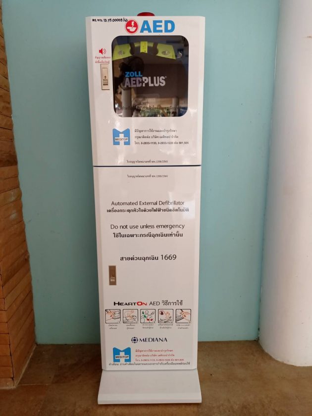 สำหรับ AED เป็นอุปกรณ์อิเล็กทรอนิกส์แบบพกพาที่ใช้ในผู้ป่วยหมดสติด้วยการใช้กระแสไฟฟ้า เป็นอุปกรณ์ที่สามารถใช้ปฐมพยาบาลช่วยเหลือผู้ป่วยฉุกเฉินได้อย่างมีประสิทธิภาพก่อนนำส่งโรงพยาบาล โดยผู้ที่ช่วยเหลือสามารถทำตามคำแนะนำของเครื่อง AED ซึ่งสามารถประเมินสถานการณ์ของผู้ป่วยได้อัตโนมัติ และช่วยกระตุ้นการทำงานของหัวใจได้อย่างทันท่วงที