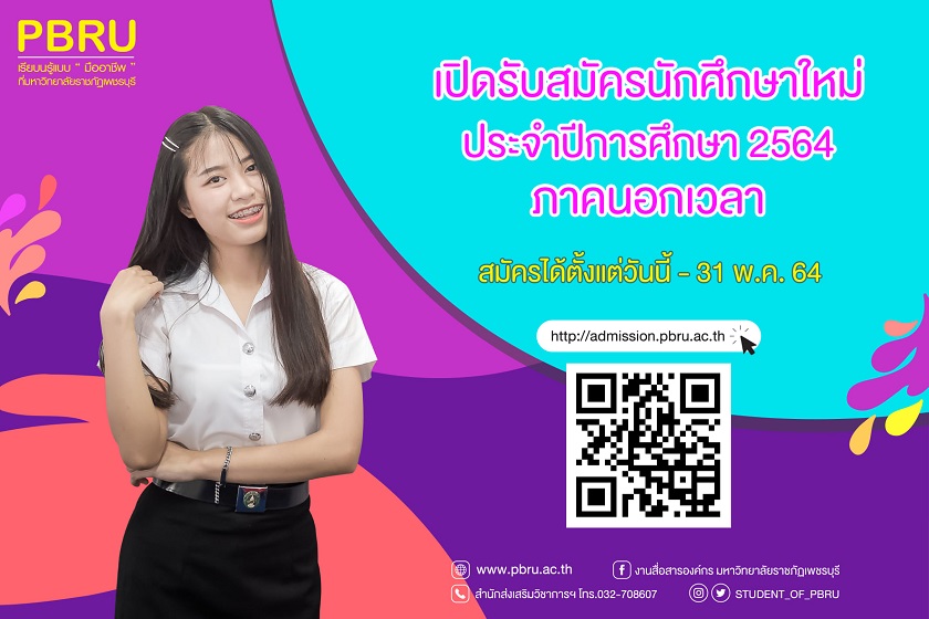 ประกาศรับสมัครนักศึกษาเข้าศึกษาต่อมหาวิทยาลัยราชภัฏเพชรบุรี ตามโครงการจัดการศึกษาสำหรับบุคลากรประจำการ (ภาคนอกเวลาปกติ) ประจำปีการศึกษา ๒๕๖๔ 26 มกราคม 202126 มกราคม 2021Soontorn Choosenpomข่าวประชาสัมพันธ์, รับสมัคร จำนวนผู้ชม : 36 ประกาศมหาวิทยาลัยราชภัฏเพชรบุรี เรื่อง รับสมัครนักศึกษาเข้าศึกษาต่อมหาวิทยาลัยราชภัฏเพชรบุรี ตามโครงการจัดการศึกษาสำหรับบุคลากรประจำการ (ภาคนอกเวลาปกติ) ประจำปีการศึกษา ๒๕๖๔ มหาวิทยาลัยราชภัฏเพชรบุรี กำหนดรับสมัครผู้สำเร็จการศึกษาระดับมัธยมศึกษาตอนปลาย หรือเทียบเท่าเข้าศึกษาต่อระดับปริญญาตรี หลักสูตร ๔ ปี (ภาคนอกเวลาปกติ) ตามโครงการจัดการศึกษาสำหรับบุคคลากรประจำการ (เรียนวันเสาร์–อาทิตย์) ประจำปีการศึกษา ๒๕๖๔ อาศัยอำนาจตามคำสั่งมหาวิทยาลัยราชภัฏเพชรบุรี ที่ ๑๖๔๐/๒๕๖๐ จึงประกาศรับสมัครนักศึกษาเข้าศึกษาต่อระดับปริญญาตรี (ภาคนอกเวลาปกติ) ประจำปีการศึกษา ๒๕๖๔ ดังรายละเอียด ต่อไปนี้ รายละเอียดเพิ่มเติม >> CLICK สนใจสมัครได้ที่ http://admission.pbru.ac.th/admis/index.jsp สาขาวิชาที่เปิดรับสมัคร – สาขาวิชารัฐประศาสนศาสตร์ แขนง การบริหารงานปกครองท้องถิ่น คณะมนุษยศาสตร์และสังคมศาสตร์ – สาขาวิชารัฐประศาสนศาสตร์ แขนง การบริหารงานภาครัฐและเอกชน คณะมนุษยศาสตร์และสังคมศาสตร์ – สาขาวิชาการบริหารธุรกิจ แขนงการจัดการ คณะวิทยาการจัดการ – สาขาวิชาการบัญชี คณะวิทยาการจัดการ – สาขาวิชานวัตกรรมดิจิทัลและระบบควบคุมอัจฉริยะ คณะเทคโนโลยีสารสนเทศ – สาขาวิชาคอมพิวเตอร์ประยุกต์ แขนง เทคโนโลยีคอมพิวเตอร์สำนักงานดิจิทัล คณะเทคโนโลยีสารสนเทศ #ข่าวจากสำนักส่งเสริมวิชาการและงานทะเบียน Facebook iconFacebookTwitter iconTwitterLINE iconLine