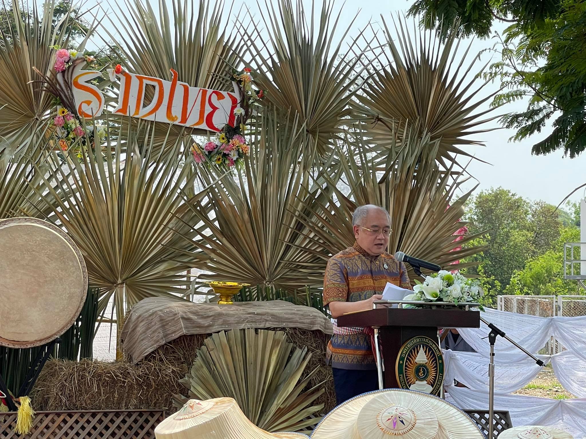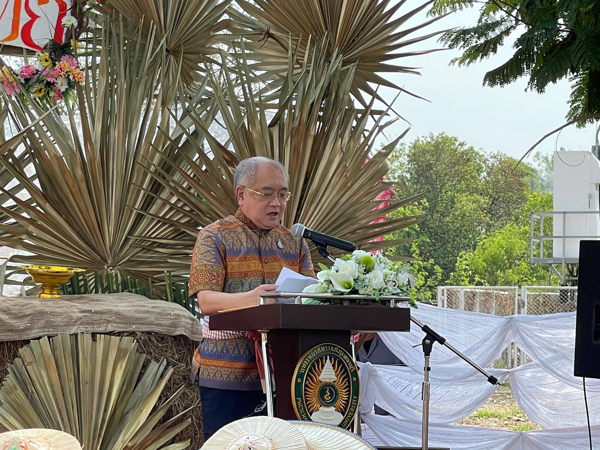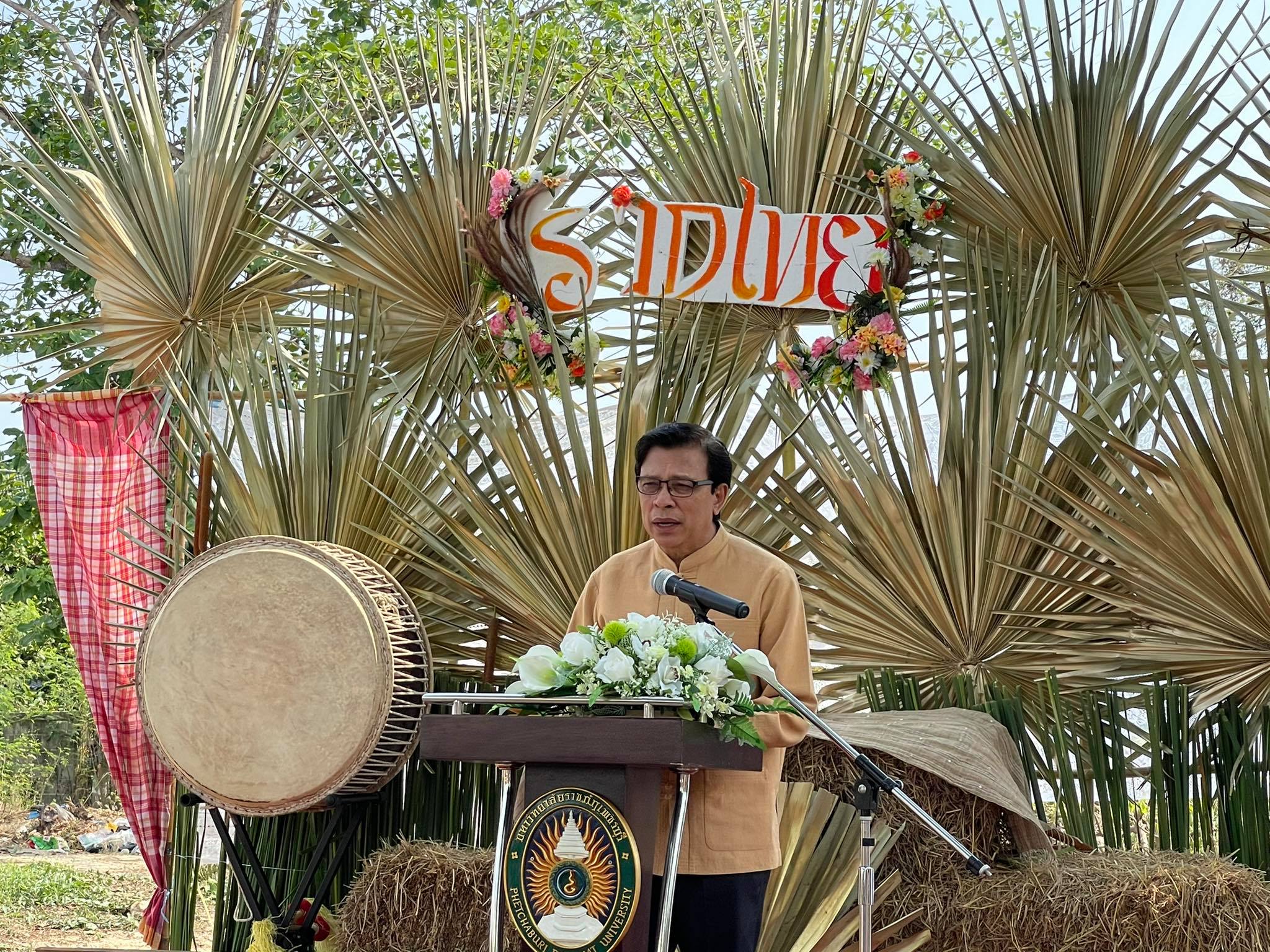 ผู้ช่วยศาสตราจารย์ ดร.เสนาะ กลิ่นงาม อธิการบดีมหาวิทยาลัยราชภัฏเพชรบุรี กล่าวว่า มหาวิทยาลัยราชภัฎเพชรบุรีเป็นหนึ่งใน 38 มหาวิทยาลัยราชภัฎที่ได้รับพระราชทานนามจากพระบาทสมเด็จพระบรมชนกาธิเบศร มหาภูมิพลอดุลยเดชมหาราช บรมนาถบพิตร ซึ่งคำว่า “ราชภัฎ” หมายถึงคนของพระราชา ข้าของแผ่นดิน นั่นหมายถึงภารกิจของมหาวิทยาลัยที่ต้องตระหนักว่าเราอยู่กับท้องถิ่น อยู่กับชุมชน จะต้องสนองพระราชปณิธานของพระองค์ท่านอย่างเต็มความสามารถ นอกจากงานสอน งานวิจัย งานบริการวิชาการ และอื่น ๆ ตามบทบาทหน้าที่ของสถาบันอุดมศึกษา กจกรรม “รากไทย ณ เมืองเพ็ชร ตอนหลักการทรงงาน” เป็นกิจกรรมหนึ่งที่เปรียบเสมือนการสืบสานพระราชปณิธานของพระองค์ท่าน รวมถึงยังเปิดโอกาสให้นักศึกษาได้มีพื้นที่ในการจัดกิจกรรม ซึ่งเป็นเครื่องมือสำหรับแลกเปลี่ยนเรียนรู้ให้เกิดประสิทธิภาพ และเพื่อให้เกิดการพัฒนาในวิชาชีพ
