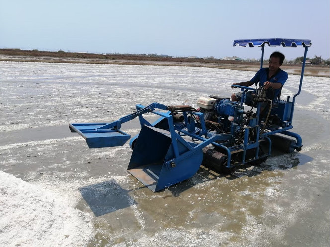 สำหรับรถลำเลียงเกลือแบบตัวตักด้านหน้ากึ่งอัตโนมัติ ทำจากเหล็กเคลือบด้วยสีกันสนิม ขับเคลื่อนล้อแบบคู่ขนาน เป็นล้อไม้ มีลักษณะเป็นทรงกระบอกยาว 90 เซนติเมตร วางขนานกันจำนวน 3 ล้อ เพื่อรองรับนํ้าหนักของตัวรถและน้ำหนักของเกลือที่ ใช้เครื่องยนต์เบนซินขนาด 13 แรงม้าเป็นต้นกำลังในการขับเคลื่อน โดยด้านหน้าของตัวรถมีตัวตักเกลือขนาดความกว้าง 60 เซนติเมตร ความยาว 60 เซนติเมตร และความลึก 60 เซนติเมตร