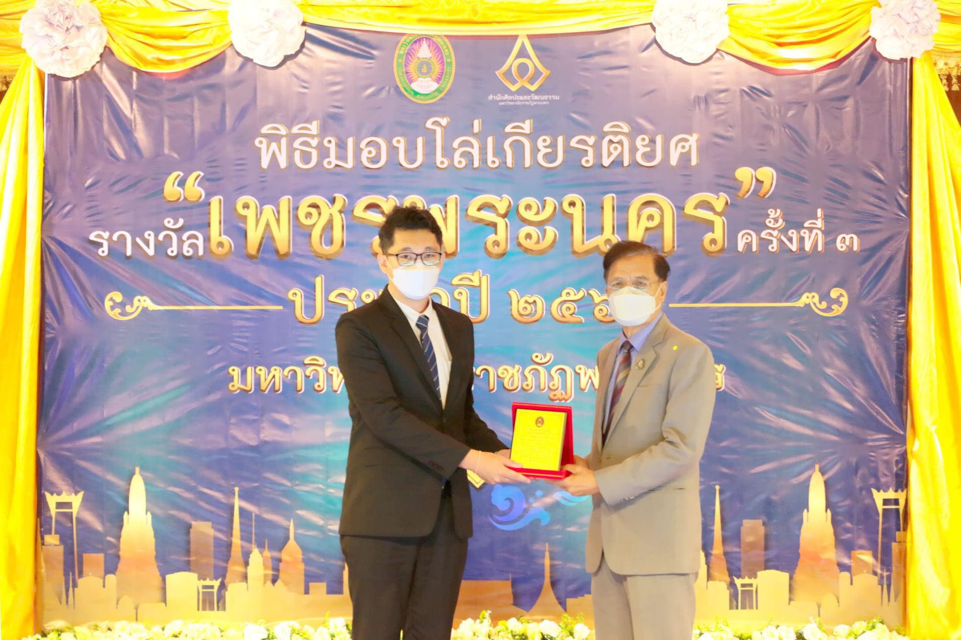 อาจารย์กิตติพันธุ์ ชินวรรณโชติ อาจารย์ประจำสาขาวิชาศิลปะและการออกแบบ คณะมนุษยศาสตร์และสังคมศาสตร์ เข้ารับมอบโล่เกียรติยศ รางวัลเพชรพระนคร ครั้งที่ 3 ประจำปี 2564 สาขาทัศนศิลป์ โดยได้รับเกียรติจากรองศาสตราจารย์ ดร.เปรื่อง กิจรัตน์ภร อธิการบดีมหาวิทยาลัยราชภัฏพระนคร เป็นผู้มอบโล่รางวัลและเกียรติบัตร ซึ่งในโอกาสนี้ อาจารย์ ดร.ทวิพัฒน์ วิจิตรปัญญารักษ์ ผู้อำนวยการสถาบันวิจัยและส่งเสริมศิลปวัฒนธรรม ได้เดินทางไปร่วมแสดงความยินดีด้วย เมื่อวันที่ 23 กันยายน 2564 ณ หอประชุมพิฆเนศวร มหาวิทยาลัยราชภัฏพระนคร