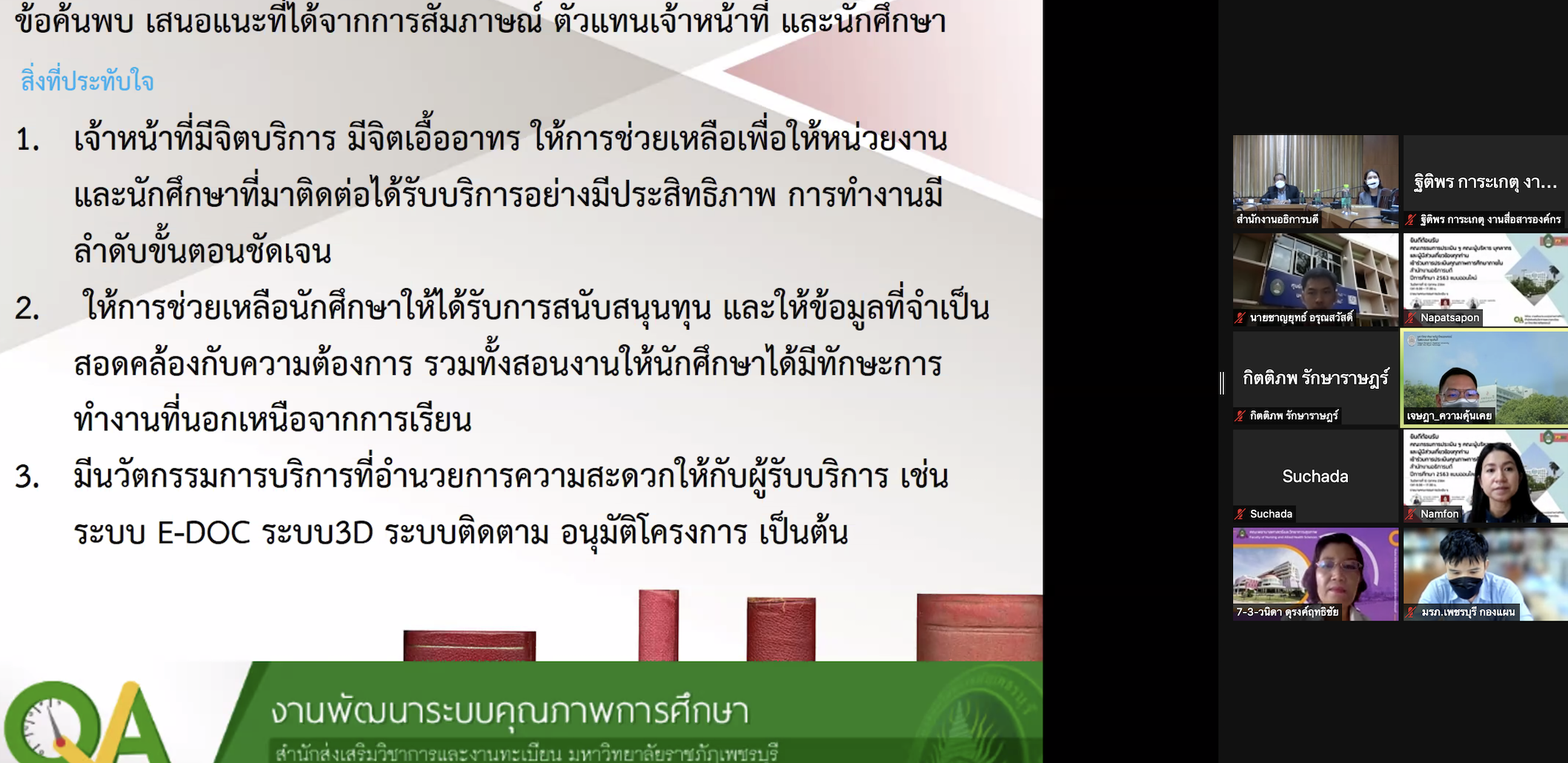 เมื่อวันที่ 12 ตุลาคม 2564 สำนักงานอธิการบดี มหาวิทยาลัยราชภัฏเพชรบุรี รับการตรวจประเมินคุณภาพการศึกษาภายในระดับสำนัก/สถาบัน ประจำปีการศึกษา 2563 โดยมีหัวหน้างานและบุคลากรสายสนับสนุนของสำนักงานอธิการบดีเข้าร่วม โอกาสนี้ได้รับเกียรติจากผู้ช่วยศาสตราจารย์ ดร.เจษฎา ความคุ้นเคย เป็นประธานกรรมการในการตรวจประเมินผ่านระบบออนไลน์
