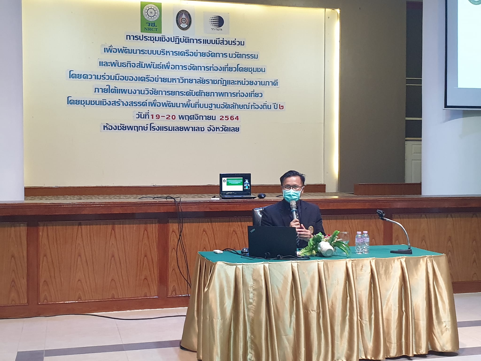 สถาบันวิจัยและส่งเสริมศิลปวัฒนธรรม มหาวิทยาลัยราชภัฏเพชรบุรี นำโดยอาจารย์ภาคย์ พราหมณ์แก้ว รองผู้อำนวยการสถาบันวิจัยฯ พร้อมด้วยอาจารย์คงขวัญ ศรีสอาด หัวหน้าโครงการวิจัยโครงการพัฒนากลยุทธ์ทางการตลาดแบบบูรณาการเพื่อเพิ่มศักยภาพการท่องเที่ยวตามวิถีชุมชนกินดื่มอาหารปลอดภัยเชิงสร้างสรรค์ภูมิภาคตะวันตก และคณะนักวิจัย ตลอดจนเครือข่ายวิจัยในพื้นที่เทศบาลตำบลบางตะบูน อำเภอบ้านแหลม จังหวัดเพชรบุรี เข้าร่วม “การประชุมเชิงปฏิบัติการแบบมีส่วนร่วม เพื่อพัฒนาระบบบริหารเครือข่ายจัดการนวัตกรรมและพันธกิจสัมพันธ์เพื่อการจัดการท่องเที่ยวโดยชุมชน โดยความร่วมมือของเครือข่ายมหาวิทยาลัยราชภัฏและหน่วยงานภาคีภายใต้แผนงานวิจัยการยกระดับศักยภาพการท่องเที่ยวโดยชุมชนเชิงสร้างสรรค์เพื่อพัฒนาพื้นที่บนฐานอัตลักษณ์ท้องถิ่น ปี 2″ วันที่ 19 – 20 พฤศจิกายน 2564 ณ โรงแรมเลยพาเลช อำเภอเมืองเลย จังหวัดเลย ร่วมกับแกนนำขับเคลื่อนระดับภูมิภาคในภาคต่าง ๆ ได้แก่ ภาคเหนือ ภาคอีสานบน ภาคอีสานล่าง กลุ่มศรีอยุธยา กลุ่มรัตนโกสินทร์ ภาคตะวันตก และภาคใต้