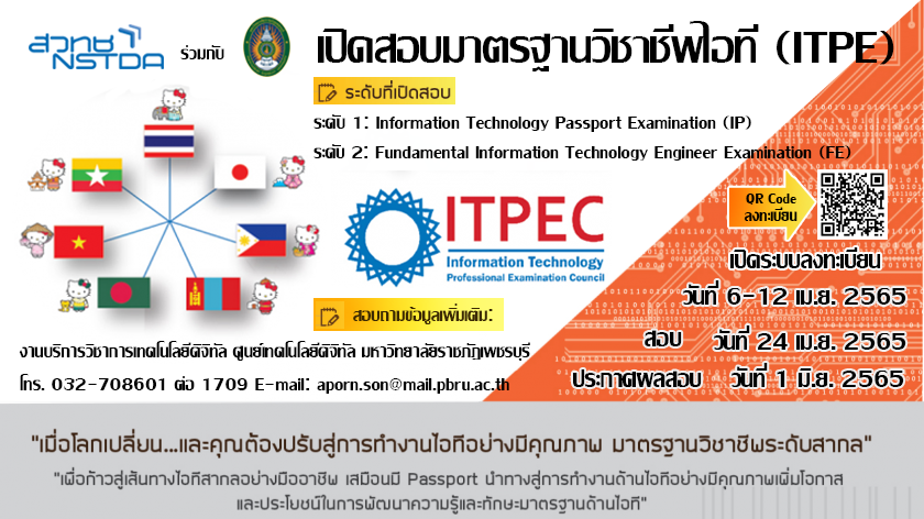 ศูนย์เทคโนโลยีดิจิทัล มหาวิทยาลัยราชภัฏเพชรบุรี ร่วมกับ สำนักงานพัฒนาวิทยาศาสตร์และเทคโนโลยีแห่งชาติ (สวทช.) จัดสอบมาตรฐานวิชาชีพไอที (ITPE) ปี 2565 ในวันที่ 24 เมษายน 2565 เพื่อวัดระดับความรู้และทักษะพื้นฐานด้านไอที 2 ระดับ ได้แก่