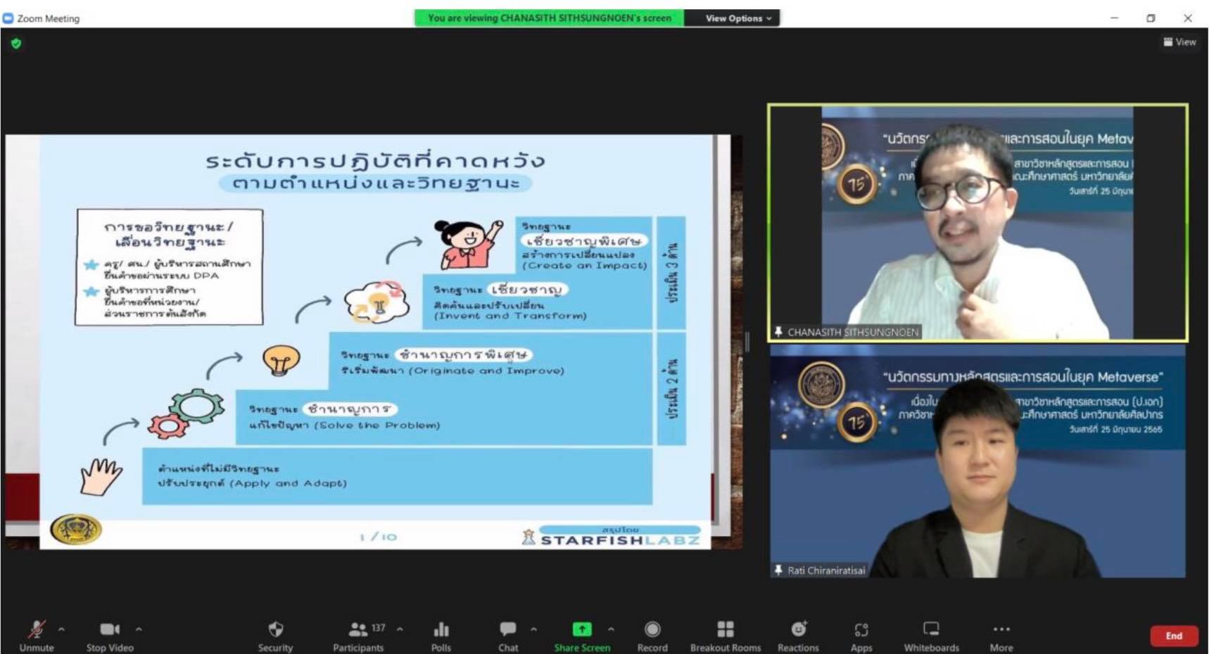 คณะครุศาสตร์จัดอบรมการประเมินวิทยฐานะและการเขียนข้อตกลงให้กับศิษย์เก่า 5 กรกฎาคม 20225 กรกฎาคม 2022Thitiporn Karaketข่าวสื่อสารองค์กร จำนวนผู้ชม : 42 คณะครุศาสตร์จัดอบรมการประเมินวิทยฐานะและการเขียนข้อตกลงให้กับศิษย์เก่า รองศาสตราจารย์ ดร.กาญจนา บุญส่ง คณบดีคณะครุศาสตร์ กล่าวให้การต้อนรับศิษย์เก่าคณะครุศาสตร์ จำนวน 137 คน ที่เข้าร่วมรับฟังการบรรยาย ในหัวข้อ ”การประเมินวิทยฐานะและการเขียนข้อตกลง (Performance Agreement: PA)” รูปแบบออนไลน์ผ่านโปรแกรม Zoom เมื่อวันที่ 2 กรกฎาคม ที่ผ่านมา สืบเนื่องจากสำนักงานคณะกรรมการข้าราชการครูและบุคลากรทางการศึกษา ได้ประกาศให้มีการดำเนินการตามเกณฑ์และวิธีการประเมินตำแหน่งและวิทยฐานะข้าราชการครูและบุคลากรทางการศึกษาในตำแหน่งครู โดยมีนโยบายมุ่งเน้นให้ข้าราชการครูและบุคลากรทางการศึกษามีการสั่งสมความชำนาญ ความเชี่ยวชาญในด้านการจัดการเรียนการสอน มีการพัฒนาตนเองและส่งเสริมให้ประพฤติตนเป็นแบบอย่างที่ดี มีวินัย คุณธรรมจริยธรรมและจรรยาบรรณวิชาชีพ พัฒนาคุณภาพการศึกษาอย่างต่อเนื่องและเป็นระบบ ส่งผลถึงคุณภาพผู้เรียนได้อย่างแท้จริง ดังนั้น เพื่อเป็นการส่งเสริมและพัฒนาความก้าวหน้าต่อวิชาชีพครูให้กับศิษย์เก่าคณะครุศาสตร์ เพชรบุรี จึงจัดอบรมออนไลน์ในหัวข้อดังกล่าวขึ้นเพื่อให้ศิษย์เก่าคณะครุศาสตร์ มีความรู้ในเรื่องการประเมินวิทยฐานะและมีทักษะในการเขียนข้อตกลงกับผู้อำนวยการ ส่งเสริมและพัฒนาความก้าวหน้าต่อวิชาชีพครูในการปฏิบัติงาน โดยได้รับเกียรติจาก ผศ.ดร.ชนสิทธิ์ สิทธิ์สูงเนิน อาจารย์ประจำภาควิชาหลักสูตรและวิธีสอน คณะศึกษาศาสตร์ มหาวิทยาลัยศิลปากร และนายรติ จิรนิรัติศัย ครูโรงเรียนท่ามะกาวิทยาคม มาเป็นวิทยากรในการบรรยายให้ความรู้เกี่ยวกับเกณฑ์วิทยฐานะ ตาม ว 9/2564 (ว PA) การเขียนข้อตกลงและประเด็นท้าทายกับผู้อำนวยการ การจัดเตรียมแผนการสอน Clip การสอนและผลลัพธ์การเรียนรู้ เพื่อขอเลื่อน/มีวิทยฐานะตาม วPA#กลุ่มงานสื่อสารองค์กรมหาวิทยาลัยราชภัฏเพชรบุรี Facebook iconFacebookTwitter iconTwitterLINE iconLine