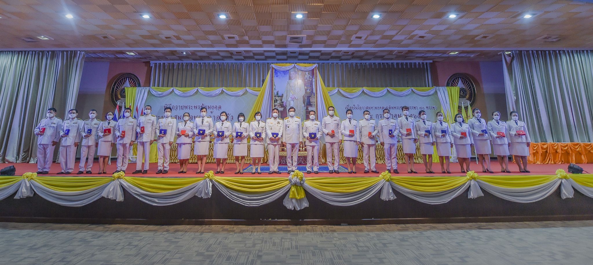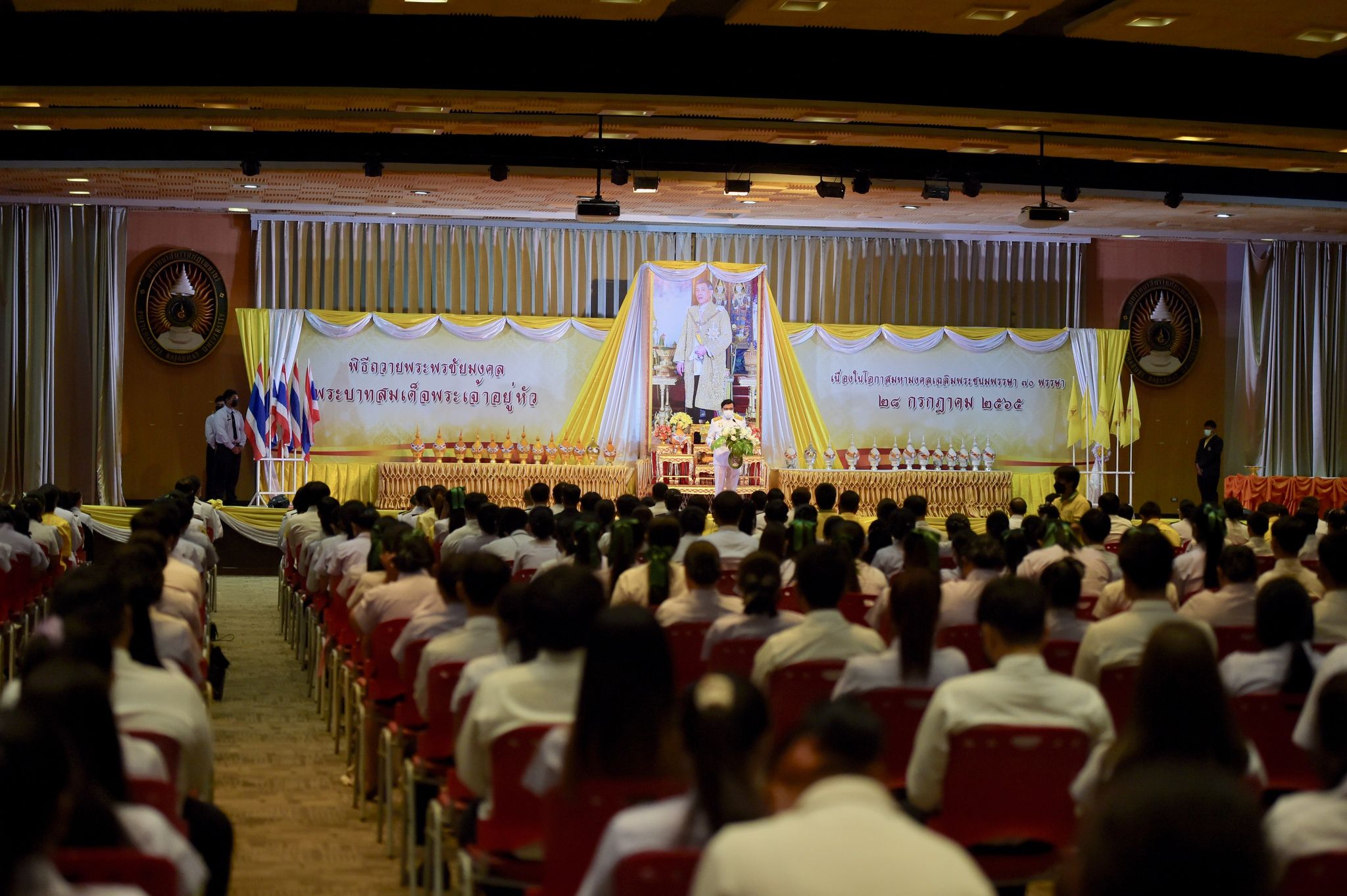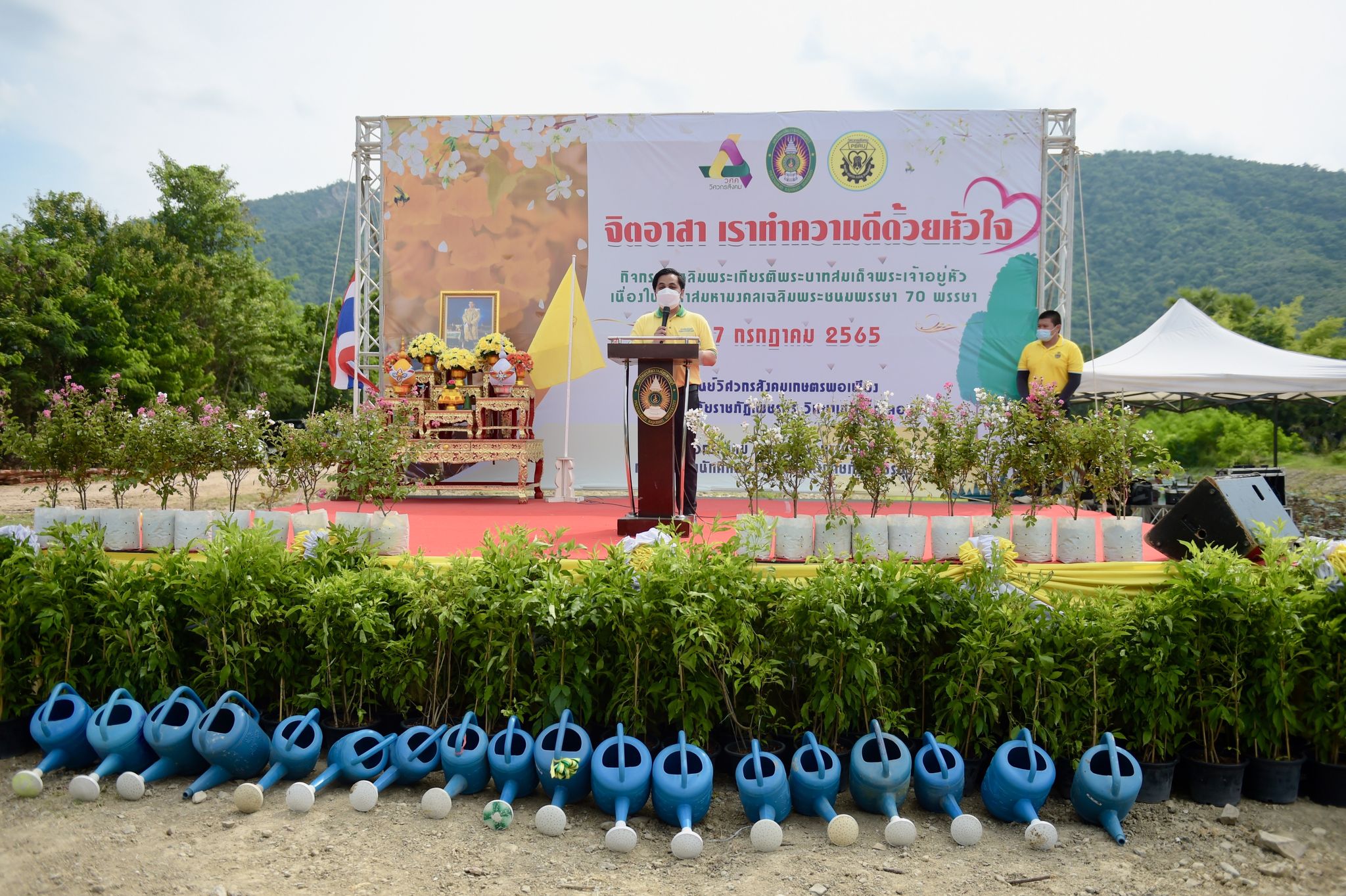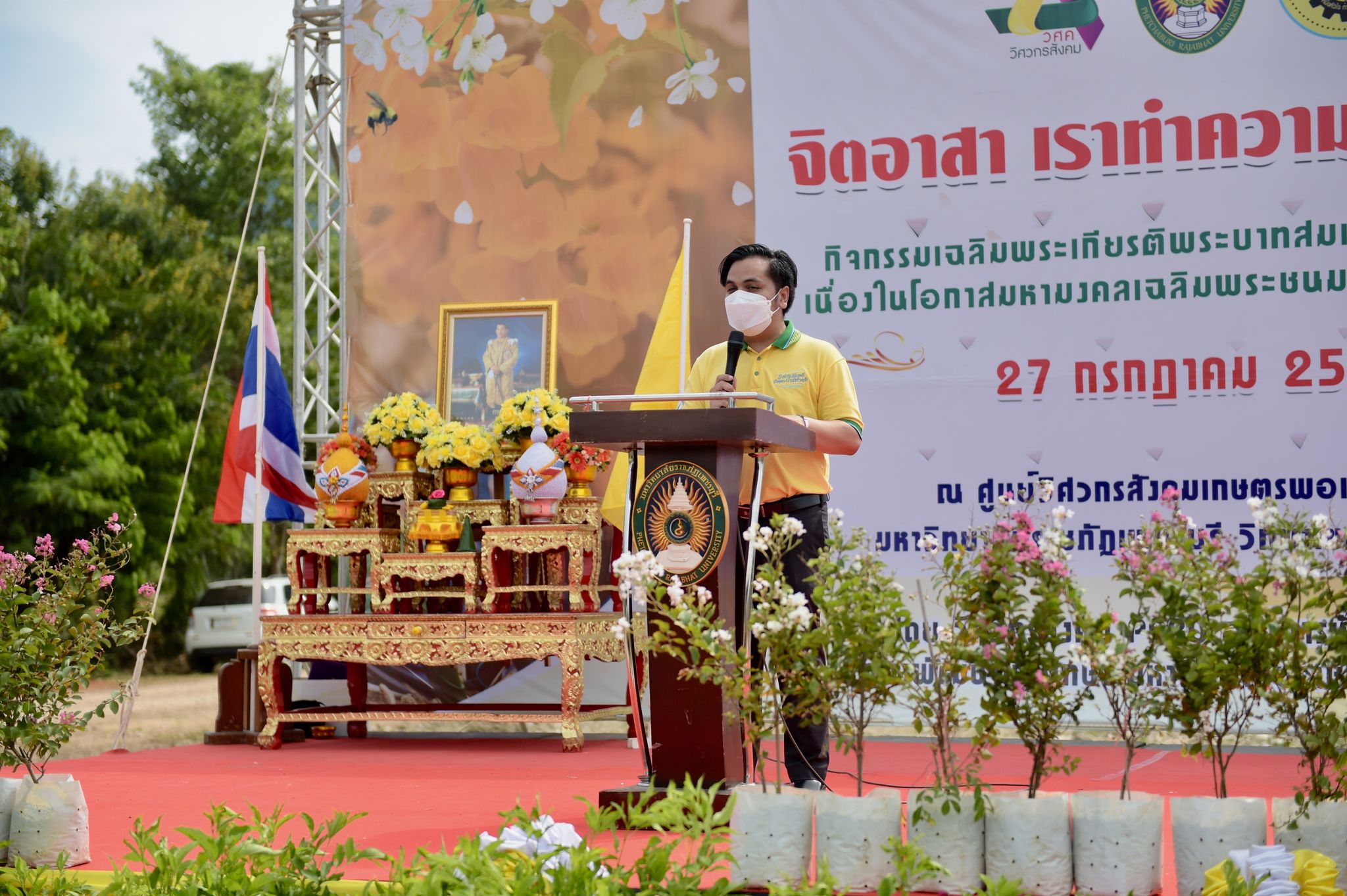 พิธีเฉลิมพระเกียรติพระบาทสมเด็จพระเจ้าอยู่หัว 27 กรกฎาคม 202228 กรกฎาคม 2022Thitiporn Karaketข่าวสื่อสารองค์กร จำนวนผู้ชม : 200 มหาวิทยาลัยราชภัฏเพชรบุรี ประกอบพิธีเฉลิมพระเกียรติพระบาทสมเด็จพระเจ้าอยู่หัว เนื่องในโอกาสมหามงคล เฉลิมพระชนมพรรษา 70 พรรษา เมื่อเวลา 09.09 น. ณ ห้องประชุมพะนอมแก้วกำเนิด อาคารสุเมธตันติเวชกุล มหาวิทยาลัยราชภัฏเพชรบุรี ผู้ช่วยศาสตราจารย์ ดร.เสนาะ กลิ่นงาม อธิการบดีมหาวิทยาลัยราชภัฏเพชรบุรี เป็นประธานในการประกอบพิธีเฉลิมพระเกียรติพระบาทสมเด็จพระเจ้าอยู่หัว เนื่องในโอกาสมหามงคล เฉลิมพระชนมพรรษา 70 พรรษา โดยมีคณะผู้บริหารมหาวิทยาลัยฯ คณาจารย์ บุคลากรและนักศึกษา เข้าร่วมกิจกรรม ในพิธี มีการวางพานพุ่มทอง พุ่มเงิน เปิดกรวย ถวายราชสักการะ อ่านคำสดุดีเฉลิมพระเกียรติ ถวายพระพรชัยมงคล และจุดเทียนชัยถวายพระพรชัยมงคล จากนั้น ประธานในพิธีและผู้เข้าร่วมพิธีได้พร้อมใจกันลงนามถวายพระพรชัยมงคล เพื่อแสดงออกถึงความจงรักภักดีและสำนึกในพระมหากรุณาธิคุณที่ทรงมีต่อชาวมหาวิทยาลัยราชภัฏ นอกจากนี้ ในพิธีดังกล่าวยังมีการมอบรางวัลการเขียนเรียงความในหัวข้อ “วิถีชีวิตใหม่ ใต้ร่มพระบารมี” และพิธีรับพระราชทานเครื่องราชอิสริยาภรณ์หน้าพระบรมฉายาลักษณ์พระบาทสมเด็จพระเจ้าอยู่หัว จำนวน 25 ราย ก่อนที่จะจบกิจกรรมในช่วงเช้าด้วยการแสดงเฉลิมพระเกียรติโดยนักศึกษาสาขาวิชานาฏศิลป์ศึกษา คณะมนุษยศาสตร์และสังคมศาสตร์ จากนั้นในช่วงบ่ายของวันเดียวกัน กองพัฒนานักศึกษายังได้นำคณะผู้บริหารมหาวิทยาลัยฯ คณาจารย์ บุคลากรและนักศึกษา เข้าร่วมกิจกรรมจิตอาสา เราทำความดีด้วยหัวใจ ณ ศูนย์วิศวกรสังคมเกษตรพอเพียง มหาวิทยาลัยราชภัฏเพชรบุรี วิทยาเขตโป่งสลอด ด้วยการปลูกต้นทองอุไรและต้นยี่เข่ง จำนวนทั้งหมด 70 ต้น เพื่อถวายเป็นพระราชกุศล เนื่องในวันคล้ายวันเฉลิมพระชนมพรรษา พระบาทสมเด็จพระเจ้าอยู่หัว และเป็นการเพิ่มพื้นที่สีเขียวให้กับวิทยาเขตโป่งสลอดในการเป็นสถานที่ท่องเที่ยว# กลุ่มงานสื่อสารองค์กร มหาวิทยาลัยราชภัฏเพชรบุรี Facebook iconFacebookTwitter iconTwitterLINE iconLine