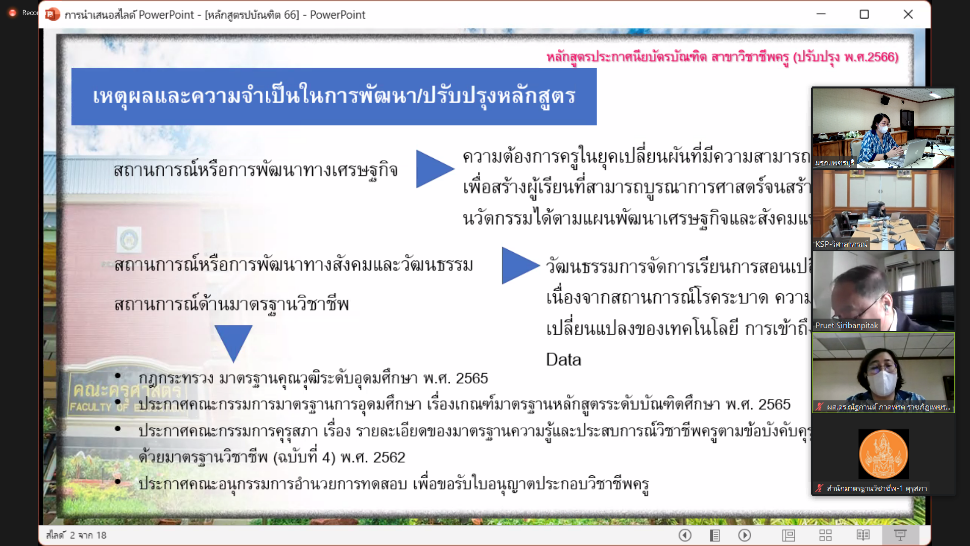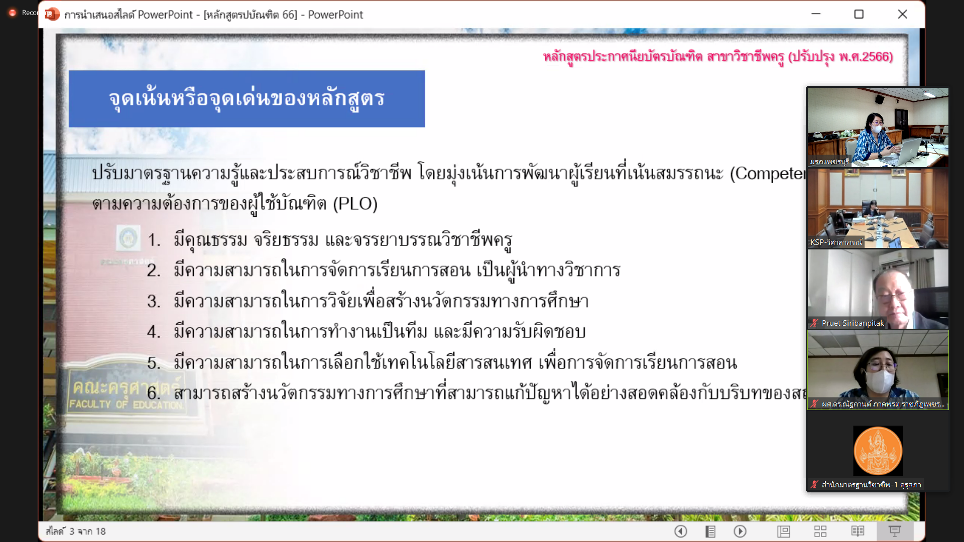 คณะครุศาสตร์ นำเสนอมาตรฐานระดับบัณฑิตศึกษา 27 กุมภาพันธ์ 202327 กุมภาพันธ์ 2023Thitiporn Karaketข่าวสื่อสารองค์กร จำนวนผู้ชม : 33 คณะครุศาสตร์ นำเสนอมาตรฐานการผลิตและมาตรฐานบัณฑิต ระดับบัณฑิตศึกษา จำนวน 2 หลักสูตร วันที่ 24 กุมภาพันธ์ 2566 รองศาสตราจารย์ ดร.กาญจนา บุญส่ง คณบดีคณะครุศาสตร์ พร้อมด้วยผู้ช่วยศาสตราจารย์ ดร.อภิชาติ เลนะนันท์ ผู้ช่วยศาสตราจารย์ ดร.ณัฐกานต์ ภาคพรต และบุคลากรทางการศึกษา เข้าร่วมนำเสนอมาตรฐานการผลิตและมาตรฐานบัณฑิต เพื่อการรับรองปริญญาทางการศึกษา ระดับบัณฑิตศึกษา จำนวน 2 หลักสูตร ได้แก่ ปริญญาครุศาสตรมหาบัณฑิต สาขาวิชาการบริหารการศึกษา และหลักสูตรประกาศนียบัตรบัณฑิต สาขาวิชาชีพครู (ป.บัณฑิต) เพื่อให้สำนักงานเลขาธิการคุรุสภาดำเนินการรับรองหลักสูตรต่อไป # กลุ่มงานสื่อสารองค์กร มหาวิทยาลัยราชภัฏเพชรบุรี Facebook iconFacebookTwitter iconTwitterLINE iconLine