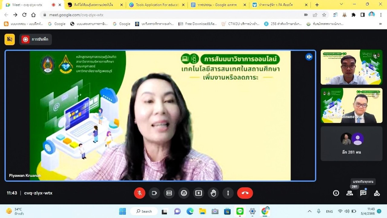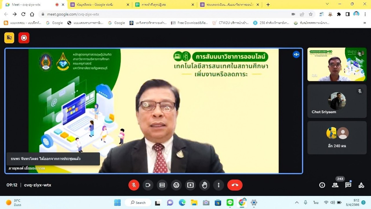 ผู้ช่วยศาสตราจารย์ ดร.เสนาะ กลิ่นงาม อธิการบดีมหาวิทยาลัยราชภัฏเพชรบุรี เป็นประธานในพิธีเปิดกิจกรรมพร้อมปาฐกถาพิเศษ การสัมมนาวิชาการออนไลน์ เรื่องเทคโนโลยีสารสนเทศในสถานศึกษา : เพิ่มงานหรือลดภาระ ที่ นักศึกษาหลักสูตรครุศาสตรดุษฎีบัณฑิต สาขาวิชาการบริหารการศึกษา คณะครุศาสตร์ มหาวิทยาลัยราชภัฏเพชรบุรีได้จัดขึ้นในรายวิชาสัมมนาเทคโนโลยีสารสนเทศและนวัตกรรมทางการบริหารการศึกษา เมื่อวันที่ 5 เมษายน 2566 ผ่านระบบออนไลน์ โดยมีผู้บริหารการศึกษา ผู้บริหารสถานศึกษา ศึกษานิเทศก์ ข้าราชการครูและบุคลากรทางการศึกษา เข้าร่วมสัมมนา จำนวน 514 ท่าน