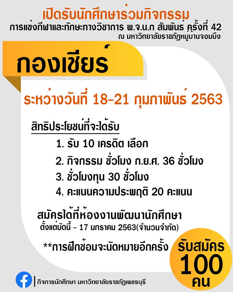 เปิดรับนักศึกษาร่วมกิจกรรม กองเชียร์ รับสมัคร 100 คน 3 มกราคม 2020nisanti sinprasertข่าวสำหรับนักศึกษา จำนวนผู้ชม : 148 เปิดรับนักศึกษาร่วมกิจกรรม กองเชียร์ รับสมัคร 100 คน การแข่งกีฬาและทักษะทางวิชาการ พ.จ.น.ก สัมพันธ์ ครั้งที่ 42 ณ มหาวิทยาลัยราชภัฏหมู่บ้านจอมบึง ระหว่างวันที่ 18-21 กุมภาพันธ์ 2563 สิทธิประโยชน์ที่จะได้รับ 1. รับ 10 เครดิต เลือก 2. กิจกรรม ชั่วโมง ก.ย.ศ. 36 ชั่วโมง 3. ชั่วโมงทุน 30 ชั่วโมง 4. คะแนนความประพฤติ 20 คะแนน สมัครได้ที่ห้องงานพัฒนานักศึกษา ตั้งแต่บัดนี้ – 17 มกราคม 2563(จำนวนจำกัด) **การฝึกซ้อมจะนัดหมายอีกครั้ง** Facebook iconFacebookTwitter iconTwitterLINE iconLine