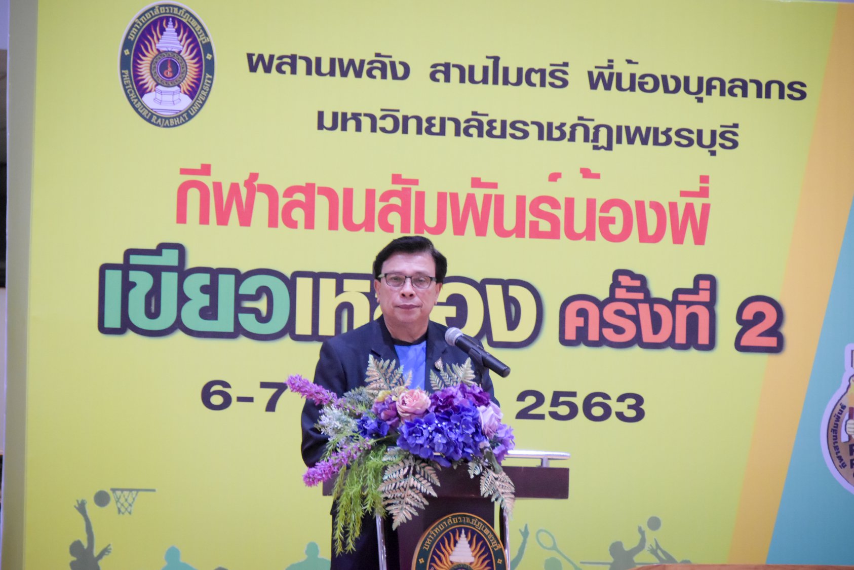 เมื่อช่วงเย็นวันที่ 6 มกราคม 2563 ณ โรงยิมเนเซียม 1 มหาวิทยาลัยราชภัฏเพชรบุรี ผู้ช่วยศาสตราจารย์ ดร.เสนาะ กลิ่นงาม อธิการบดีมหาวิทยาลัยราชภัฏเพชรบุรี เป็นประธานเปิดการแข่งขันกีฬาสี สานสัมพันธ์น้องพี่เขียว – เหลือง โดยคณะผู้บริหารมหาวิทยาลัยฯ คณาจารย์และบุคลากร เข้าร่วม