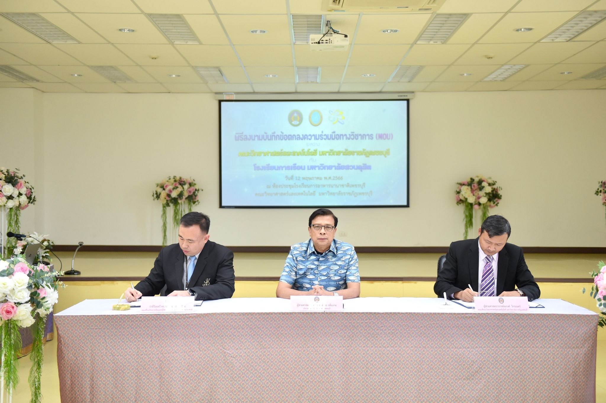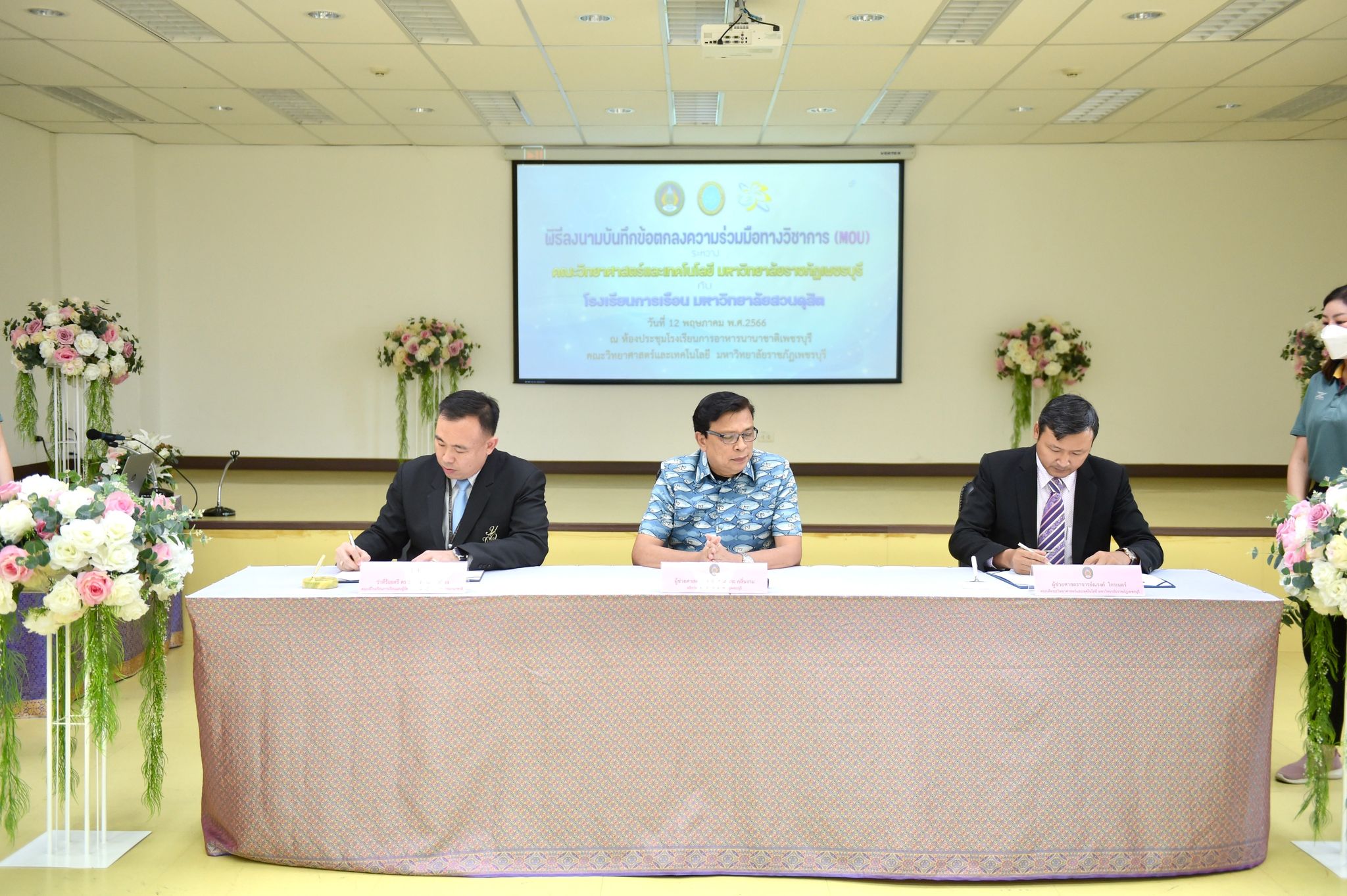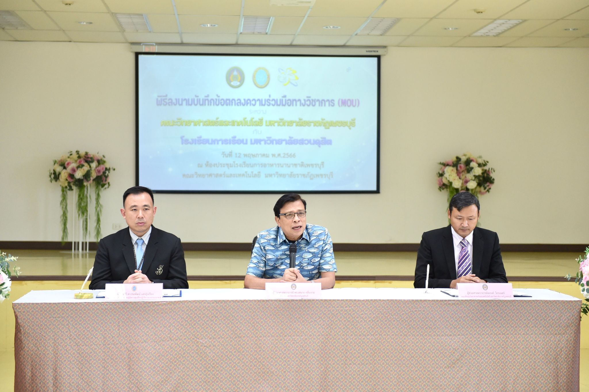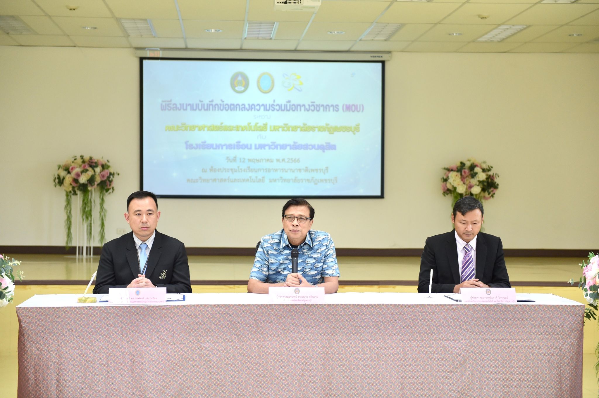 ลงนามความร่วมมือด้านคหกรรมศาสตร์ 12 พฤษภาคม 202316 มิถุนายน 2023Thitiporn Karaketข่าวสื่อสารองค์กร จำนวนผู้ชม : 65 คณะวิทยาศาสตร์และเทคโนโลยี ลงนามความร่วมมือกับโรงเรียนการเรือน มหาวิทยาลัยสวนดุสิต ในการพัฒนาการเรียนการสอน การบริการวิชาการและการวิจัยที่เกี่ยวข้องกับคหกรรมศาสตร์ วันที่ 12 พฤษภาคม 2566 ณ ห้องประชุมชั้น 5 โรงเรียนการอาหารนานาชาติเพชรบุรี มหาวิทยาลัยราชภัฏเพชรบุรี ผู้ช่วยศาสตราจารย์ ดร.เสนาะ กลิ่นงาม อธิการบดีมหาวิทยาลัยราชภัฏเพชรบุรี เป็นประธานในพิธีลงนามบันทึกข้อตกลงความร่วมมือทางวิชาการกับโรงเรียนการเรือน มหาวิทยาลัยสวนดุสิต โดยมีผู้ช่วยศาสตราจารย์ณรงค์ ไกรเนตร์ คณบดีคณะวิทยาศาสตร์และเทคโนโลยี มหาวิทยาลัยราชภัฏเพชรบุรี ร่วมลงนามบันทึกข้อตกลงความร่วมมือกับว่าที่ร้อยตรี ดร.ธนพัฒน์ แสงรุ่งเรือง คณบดีโรงเรียนการเรือน มหาวิทยาลัยสวนดุสิต การลงนามบันทึกข้อตกลงความร่วมมือทางวิชาการในครั้งนี้ เพื่อพัฒนาการเรียนการสอน การบริการวิชาการและการวิจัยที่เกี่ยวข้องกับคหกรรมศาสตร์ ร่วมกันผลักดันให้เกิดการขยายตัวของการเรียนการสอนและการวิจัยเกี่ยวกับคหกรรมศาสตร์ที่มีคุณภาพสูง ร่วมกันสนับสนุนให้มีการแลกเปลี่ยนบุคลากร นิสิต นักศึกษา และองค์ความรู้เพื่อพัฒนาหลักสูตรและการวิจัยด้านคหกรรมศาสตร์ โดยทั้งสองสถาบันจะร่วมมือกันในการพัฒนาการเรียนการสอน การแลกเปลี่ยนอาจารย์ การสร้างหลักสูตร การสร้างห้องปฏิบัติการเพื่อการเรียนรู้ รวมถึงการบูรณาการความรู้ การวิจัยและบริการวิชาการ การตีพิมพ์ผลงานทางวิชาการและการจัดประชุมทางวิชาการทั้งในระดับชาติและระดับนานาชาติ การพัฒนานิสิต นักศึกษา ผ่านการจัดโครงการและกิจกรรม สนับสนุนการสร้างความเข้มแข็งด้านการเรียนการสอนและการวิจัยตามสาขาที่เชี่ยวชาญผ่านการแลกเปลี่ยนบุคลากร คณาจารย์และนักวิจัย หรือกิจกรรมอื่น ๆ ที่เกี่ยวข้องโอกาสนี้ บุคลากรจากโรงเรียนการเรือน มหาวิทยาลัยสวนดุสิต ได้อบรมและฝึกปฏิบัติการทำอาหารคาวและอาหารหวานให้กับนักศึกษาสาขาวิชาอาหารและโภชนาการประยุกต์และสาขาวิชาเทคโนโลยีและศิลปะการประกอบอาหาร#กลุ่มงานสื่อสารองค์กร มหาวิทยาลัยราชภัฏเพชรบุรี Facebook iconFacebookTwitter iconTwitterLINE iconLine