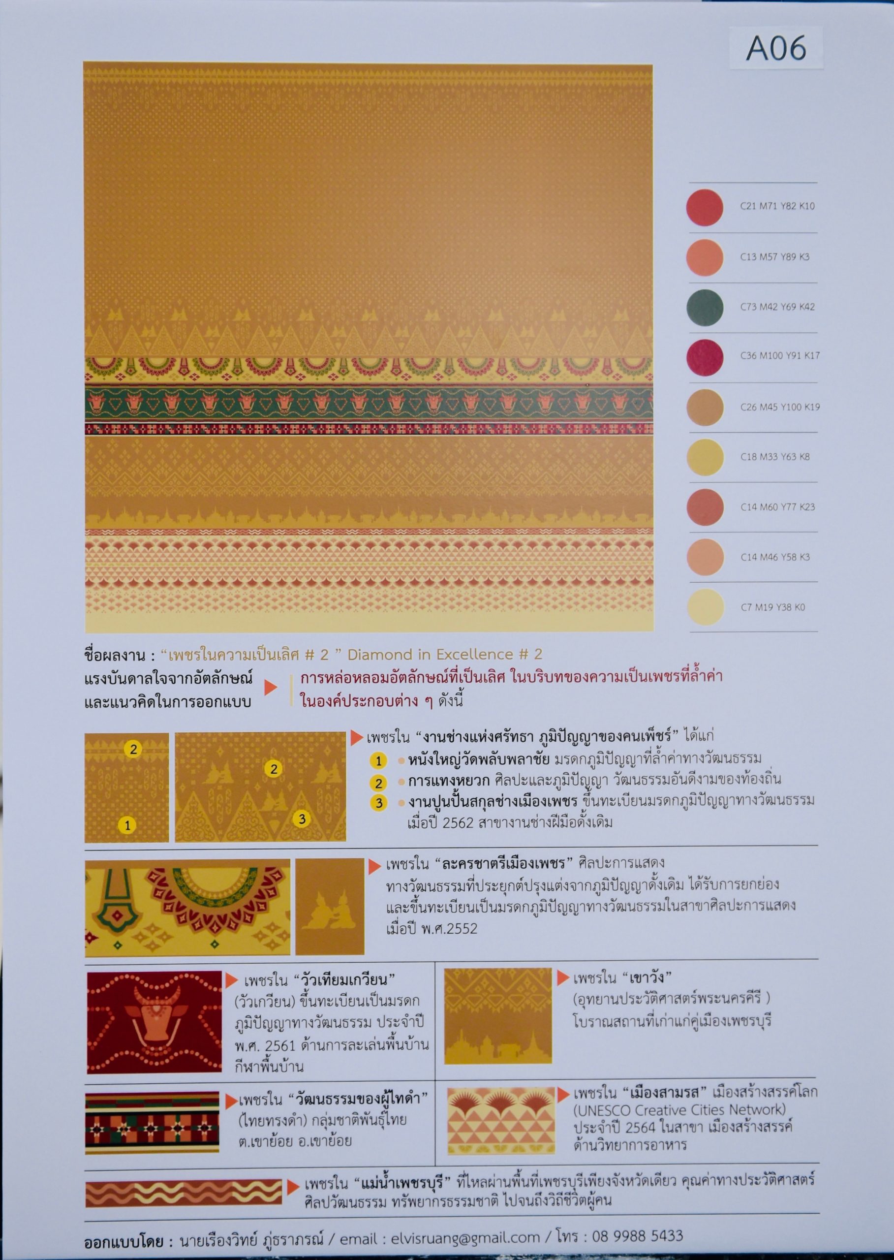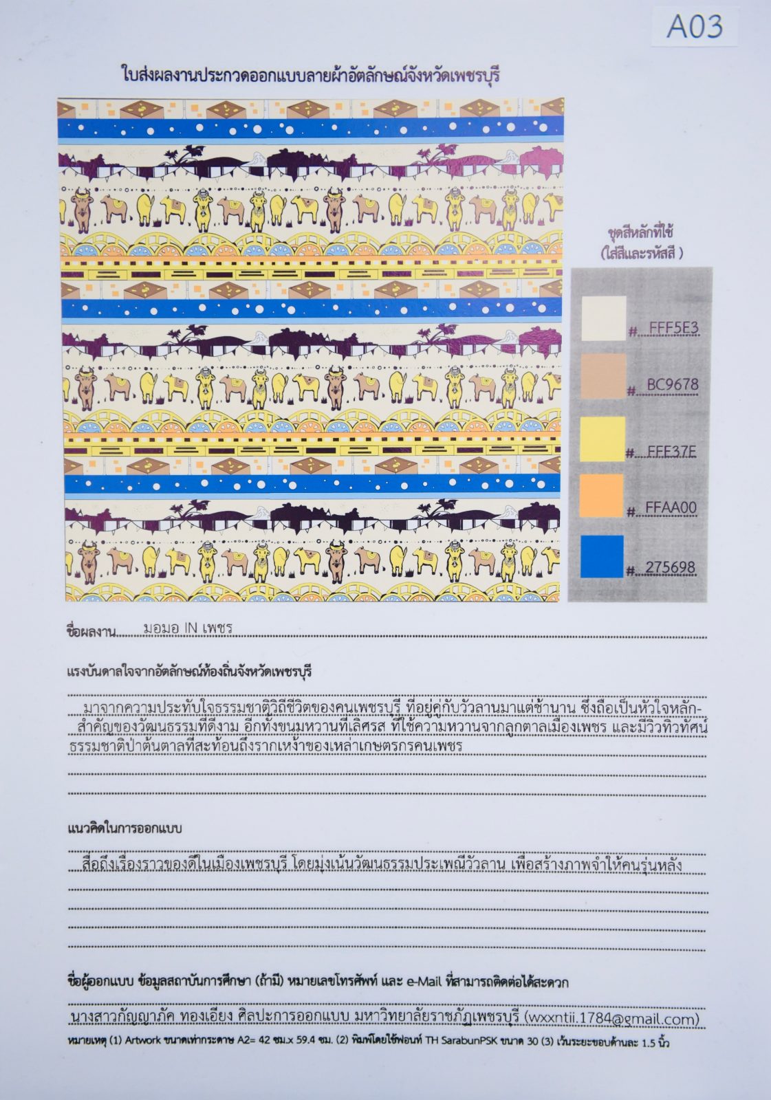 ตัดสินการประกวดผลงานการออกแบบลายผ้าอัตลักษณ์จังหวัดเพชรบุรี 12 กรกฎาคม 202312 กรกฎาคม 2023Thitiporn Karaketข่าวสื่อสารองค์กร จำนวนผู้ชม : 308 มหาวิทยาลัยราชภัฏเพชรบุรี ตัดสินการประกวดผลงานการออกแบบลายผ้าอัตลักษณ์จังหวัดเพชรบุรีสู่เศรษฐกิจสร้างสรรค์ พัฒนาต่อยอดเชิงพาณิชย์ ผู้ช่วยศาสตราจารย์ ดร.เสนาะ กลิ่นงาม อธิการบดีมหาวิทยาลัยราชภัฏเพชรบุรี เป็นประธานในการตัดสินการประกวดผลงานการออกแบบลายผ้าอัตลักษณ์จังหวัดเพชรบุรีสู่เศรษฐกิจสร้างสรรค์ รองชิงชนะเลิศ ที่มหาวิทยาลัยราชภัฏเพชรบุรีได้จัดขึ้นเมื่อวันที่ 12 กรกฎาคม 2566 ณ บริเวณห้องโถง ชั้น 1 อาคารสถาบันช่างเมืองเพชรและศิลปะร่วมสมัย คณะมนุษยศาสตร์และสังคมศาสตร์ มหาวิทยาลัยราชภัฏเพชรบุรี โดยมีคณะกรรมการผู้ทรงคุณวุฒิที่มีความเชี่ยวชาญในเรื่องของลายผ้าและการออกแบบร่วมเป็นผู้ตัดสิน มหาวิทยาลัยราชภัฏเพชรบุรี ได้ดำเนินกิจกรรมโครงการประกวดออกแบบลายผ้าอัตลักษณ์จังหวัดเพชรบุรีสู่เศรษฐกิจสร้างสรรค์ เพื่อส่งเสริมและสืบสานวัฒนธรรมในการ สร้างสรรค์ลายผ้าอัตลักษณ์ของจังหวัดเพชรบุรี ตลอดจนเพื่อก้าวไปสู่การพัฒนาผลิตภัณฑ์ เชิงพาณิชย์เป็นการสร้างรายได้ให้แก่ผู้ผลิตและชุมชนต่อไป โดยได้เปิดรับสมัครผู้สนใจจากทั่วประเทศเข้าร่วมส่งผลงานตั้งแต่วันที่ 26 พฤษภาคม – 30 มิถุนายน 2566 ซึ่งมีผู้ให้ความสนใจส่งผลงานเข้าร่วมประกวดจำนวนทั้งสิ้น 71 ผลงาน ก่อนที่จะมีการพิจารณาตัดสินให้เหลือ 39 ผลงาน และ 6 ผลงานตามลำดับ หลักเกณฑ์ในการพิจารณาในรอบชิงชนะเลิศ ประกอบด้วย แนวความคิดของผลงารสื่อได้ตรงตามอัตลักษณ์จังหวัดเพชรบุรีสู่เศรษฐกิจสร้างสรรค์ การจัดวางองค์ประกอบของลาย การเลือกใช้สีและลวดลายที่แสดงถึงความโดดเด่นตามอัตลักษณ์จังหวัดเพชรบุรีสู่เศรษฐกิจสร้างสรรค์ ความคิดสร้างสรรค์ในการออกแบบและการต่อยอดผลงานในเชิงพาณิชย์ ตอบโจทย์ความต้องการของผู้บริโภค สำหรับผลการตัดสิน ผู้ที่ได้รับรางวัลชนะเลิศได้รับเงินรางวัล 20,000 บาท พร้อมเกียรติบัตร ได้แก่ นางสาวกัญญาภัค ทองเอียง นักศึกษาสาขาวิชาศิลปะและการออกแบบ คณะมนุษยศาสตร์และสังคมศาสตร์ มหาวิทยาลัยราชภัฏเพชรบุรี กับผลงานที่มีชื่อว่า มอมอ IN เพชร ภายใต้แนวคิดวิถีชีวิตของคนเพชรบุรีกับการละเล่นวัวลาน รวมถึงขนมหวานจากลูกตาลเมืองเพชร และวิวธรรมชาติป่าตาลที่สะท้อนให้เห็นถึงรากเหง้าของความเป็นเพชรบุรี หลังจากนี้ ผลงานลายผ้าอัตลักษณ์ที่ได้รับการคัดเลือก มหาวิทยาลัยราชภัฏเพชรบุรีจะนำไปต่อยอดในเชิงพาณิชย์ เพิ่มมูลค่าสินค้