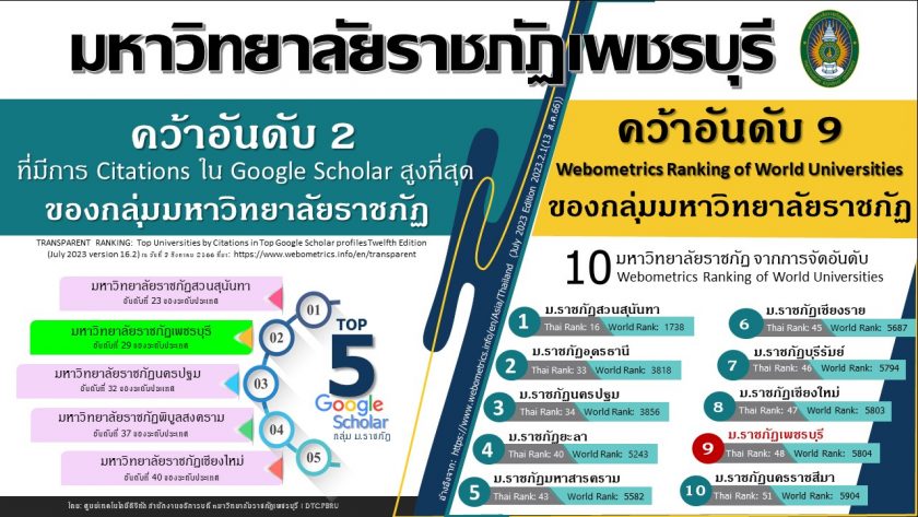 มหาวิทยาลัยราชภัฏเพชบุรี คว้าอันดับที่ 2 Google Scholar และ อันดับที่ 9 Webometrics Ranking Web of Universities July 2023