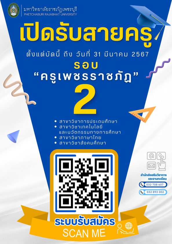 ตามประกาศมหาวิทยาลัยราชภัฏเพชรบุรี เรื่อง เปลี่ยนแปลงกำหนดการรับสมัครนักศึกษาเข้าศึกษาต่อระดับปริญญาตรี ภาคปกติ ประจำปีการศึกษา 2567 ลงวันที่ 20 ตุลาคม พ.ศ.2566 กำหนดให้วันที่ 14 มกราคม พ.ศ. 2567 เป็นวันสิ้นสุดการรับสมัครนักศึกษาเข้าศึกษาต่อหลักสูตรครุศาสตรบัณฑิต สาขาวิชาการศึกษาปฐมวัย พลศึกษา การประถมศึกษา เทคโนโลยีและนวัตกรรมทางการศึกษา ภาษาไทย และสังคมศึกษา แต่เนื่องจากยังมีผู้สนใจมีความประสงค์จะสมัครเข้าศึกษาต่อในหลักสูตรครุศาสตรบัณฑิต และแผนรับสมัครในบางสาขาวิชายังสามารถรับเพิ่มเติมได้ เพื่อเป็นการเปิดโอกาสให้ผู้สนใจและมีความประสงค์จะสมัครเข้าศึกษาต่อ สามารถสมัครเข้าศึกษาต่อในหลักสูตรครุศาสตรบัณฑิต ประจำปีการศึกษา 2567 มหาวิทยาลัยราชภัฏเพชรบุรี จึงประกาศรับสมัครนักศึกษาเข้าศึกษาต่อหลักสูตรครุศาสตรบัณฑิต รอบครูเพชรราชภัฏ 2 ตั้งแต่บัดนี้ ถึง วันที่ 31 มีนาคม 2567 ในสาขาวิชาดังต่อไปนี้