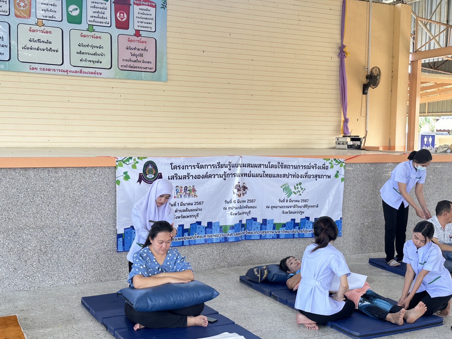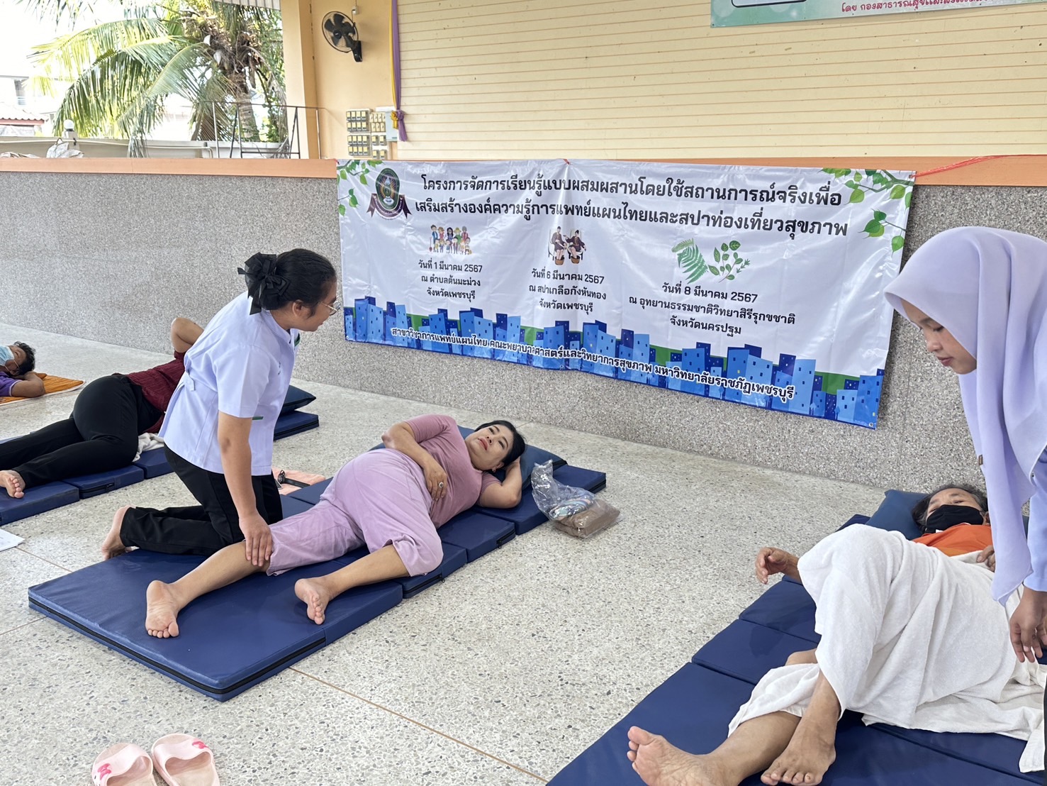 วันที่ 1 มีนาคม 2567 นักเรียนแพทย์แผนไทยชั้นปีที่ 3 ได้ออกบริการวิชาการ ซักประวัติตรวจร่างกายวินิจฉัยโรคทางการแพทย์แพทย์แผนไทย ทำหัตถการ ได้แก่ การนวด ประคบสมุนไพร การแช่เท้าสมุนไพร และให้คำแนะนำแก่ประชาชนตำบลต้นมะม่วง จังหวัดเพชรบุรี ภายใต้โครงการจัดการเรียนรู้แบบผสมผสานโดยใช้สถานการณ์จริงเพื่อเสริมสร้างองค์ความรู้การแพทย์แผนไทยและสปาท่องเที่ยวสุขภาพ ณ องค์การบริหารส่วนตำบลต้นมะม่วง อำเภอเมือง จังหวัดเพชรบุรี เพื่อให้นักศึกษาได้ฝึกปฏิบัติในชุมชน เกิดการต่อยอดองค์ความรู้ ทักษะทางวิชาการและวิชาชีพ อีกทั้งยังเป็นการบริการวิชาการแก่ประชาชนทั่วไปโดยมีผู้เข้ารับการบริการด้านการแพทย์แผนไทย จำนวน 47 คน