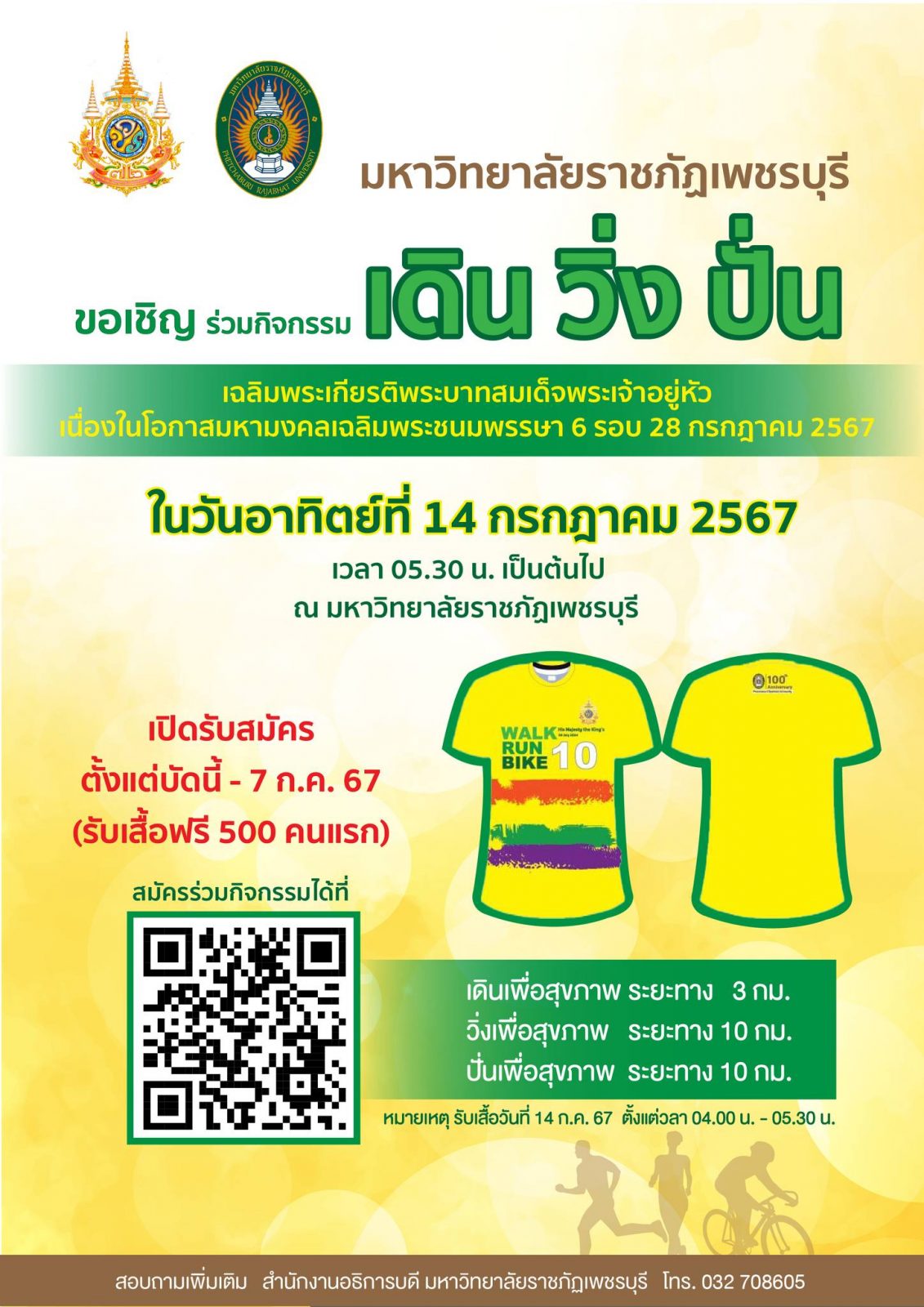 มหาวิทยาลัยราชภัฏเพชรบุรี ขอเชิญร่วมกิจกรรม “เดิน วิ่ง ปั่น เฉลิมพระเกียรติพระบาทสมเด็จพระเจ้าอยู่หัว เนื่องในโอกาสมหามงคลเฉลิมพระชนมพรรษา 6 รอบ 28 กรกฎาคม 2567 26 มิถุนายน 202426 มิถุนายน 2024piyanunกิจกรรมนักศึกษา, ข่าวประชาสัมพันธ์, ข่าวสำหรับบุคลากร, ข่าวสื่อสารองค์กร จำนวนผู้ชม : 10 มหาวิทยาลัยราชภัฏเพชรบุรีขอเชิญร่วมกิจกรรม “เดิน วิ่ง ปั่นเฉลิมพระเกียรติพระบาทสมเด็จพระเจ้าอยู่หัวเนื่องในโอกาสมหามงคลเฉลิมพระชนมพรรษา 6 รอบ28 กรกฎาคม 2567″ในวันอาทิตย์ที่ 14 กรกฎาคม 2567เวลา 05.30 น. เป็นต้นไปณ มหาวิทยาลัยราชภัฏเพชรบุรีเปิดรับสมัครตั้งแต่บัดนี้ – 7 กรกฎาคม 2567รับเสื้อฟรี 500 คนแรกสมัครได้ที่https://docs.google.com/…/1SNK54J0knKyKUFoy…/viewform…สอบถามเพิ่มเติมสำนักงานอธิการบดี มหาวิทยาลัยราชภัฏเพชรบุรีโทร 032 708605 Facebook iconFacebookTwitter iconTwitterLINE iconLine
