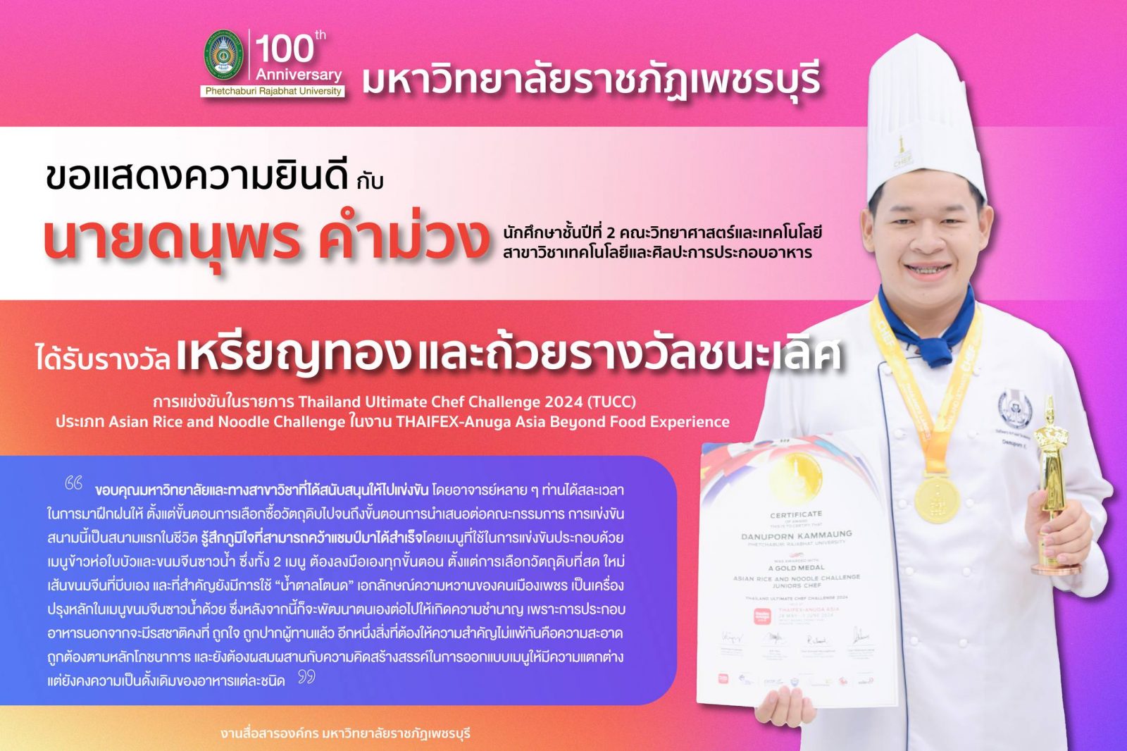 มหาวิทยาลัยราชภัฏเพชรบุรีขอแสดงความยินดีกับนายดนุพร คำม่วงได้รับรางวัญเหรียญทองและถ้วยรางวัลชนะเลิศการแข่งขันThailand Ultimate Chef Challenge 2024 (TUCC) 27 มิถุนายน 20241 กรกฎาคม 2024piyanunกิจกรรมนักศึกษา, ข่าวประชาสัมพันธ์, ข่าวสำหรับนักศึกษา, ข่าวสำหรับบุคลากร, ข่าวสื่อสารองค์กร จำนวนผู้ชม : 8 💚💛มหาวิทยาลัยราชภัฏเพชรบุรี💚💛 🎉🎉ขอแสดงความยินดีกับ🎉🎉 👨🍳 นายดนุพร คำม่วง นักศึกษาชั้นปีที่ 2 สาขาวิชาเทคโนโลยีและศิลปะการประกอบอาหารคณะวิทยาศาสตร์และเทคโนโลยี 🏆🥇ได้รับรางวัญเหรียญทองและถ้วยรางวัลชนะเลิศ การแข่งขันThailand Ultimate Chef Challenge 2024 (TUCC) ประเภท Asian Rice and Noodle Challenge ในงาน THAIFEX-Anuga Asia Beyond Food Experience ณ อิมแพค เมืองทองธานี ระหว่างวันที่ 28 พ.ค. – 1 มิ.ย. 67 Facebook iconFacebookTwitter iconTwitterLINE iconLine