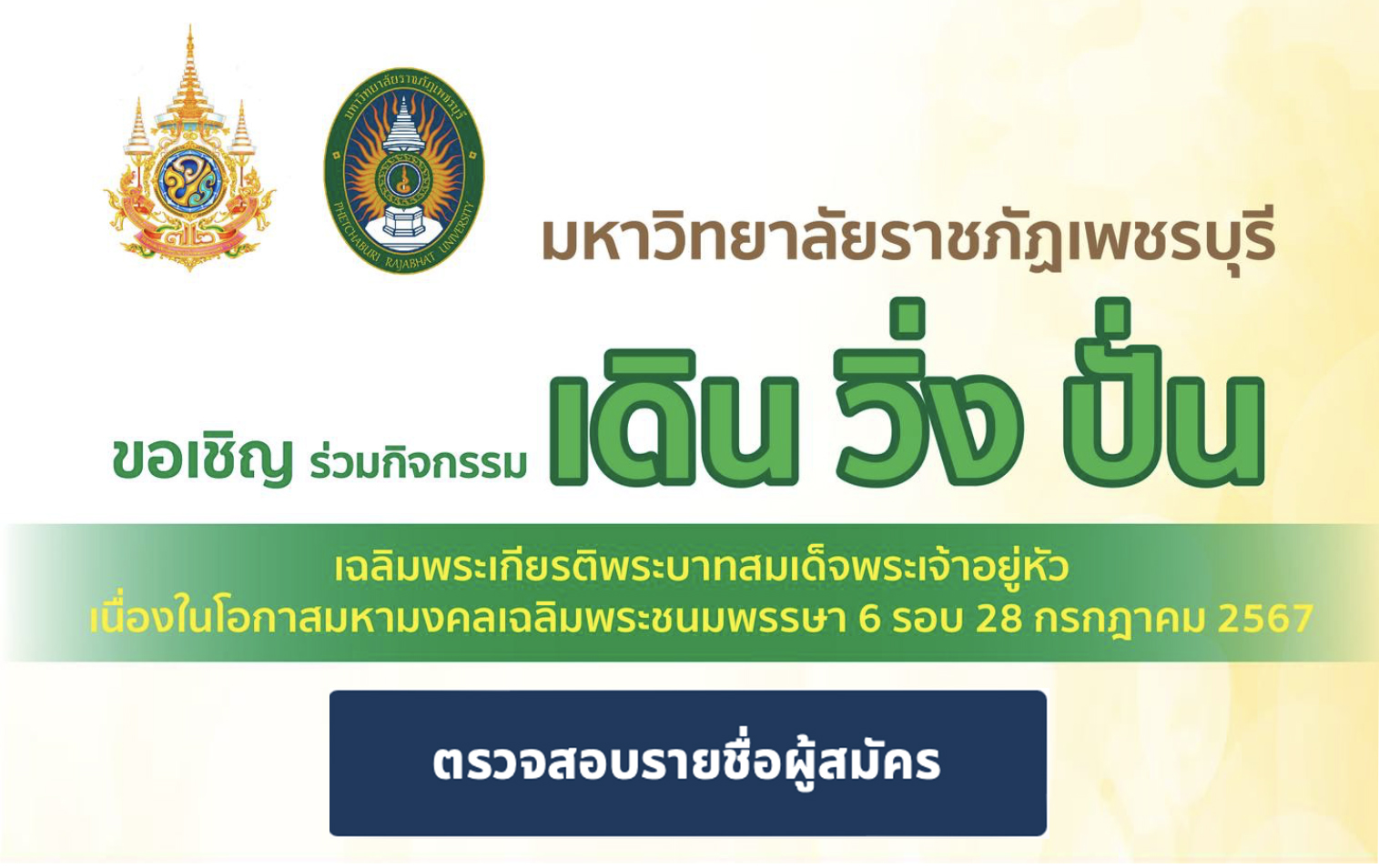 ผู้สมัครสามารถเข้าไปตรวจสอบรายชื่อ กิจกรรม เดิน วิ่ง ปั่น 9 กรกฎาคม 20249 กรกฎาคม 2024piyanunกิจกรรมนักศึกษา, ข่าวประชาสัมพันธ์, ข่าวสำหรับบุคลากร, ข่าวสื่อสารองค์กร จำนวนผู้ชม : 12 ผู้สมัครสามารถเข้าไปตรวจสอบรายชื่อ กิจกรรม เดิน วิ่ง ปั่น กิจกรรม เดิน วิ่ง ปั่น เฉลิมพระเกียรติพระบาทสมเด็จพระเจ้าอยู่หัว เนื่องในโอกามหามงคลเฉลิมพระชนมพรรษา 6 รอบ 72 พรรษาผู้สมัครสามารถเข้าไปตรวจสอบรายชื่อได้ที่ลิงก์ https://www.pbru.ac.th/wrb10/ #มหาวิทยาลัยราชภัฏเพชรบุรี#ราชภัฏเพชรบุรีกับการพัฒนาระบบการบริหารองค์กรที่มีประสิทธิภาพ#100ปีราชภัฏเพชรบุรี Facebook iconFacebookTwitter iconTwitterLINE iconLine