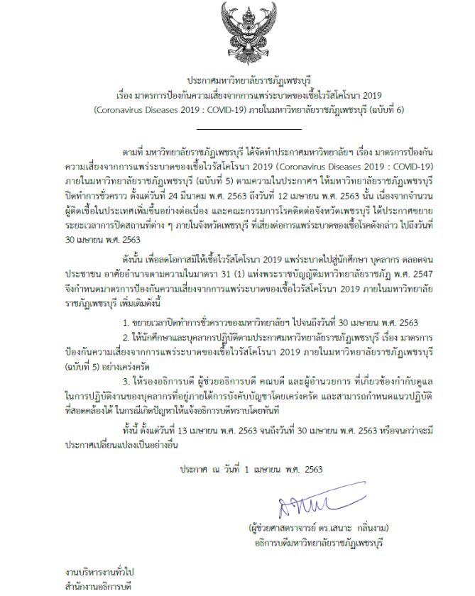 ประกาศมหาวิทยาลัยราชภัฏเพชรบุรี เรื่อง มาตรการป้องกันความเสี่ยงจากการแพร่ระบาดของเชื้อไวรัสโคโรน่า 2019 (Coronavirus Diseases 2019 : COVID-19) ภายในมหาวิทยาลัยราชภัฏเพชรบุรี (ฉบับที่ 6) 1 เมษายน 20201 เมษายน 2020Soontorn Choosenpomข่าวเด่น จำนวนผู้ชม : 374 ประกาศมหาวิทยาลัยราชภัฏเพชรบุรี เรื่อง มาตรการป้องกันความเสี่ยงจากการแพร่ระบาดของเชื้อไวรัสโคโรน่า 2019 (Coronavirus Diseases 2019 : COVID-19) ภายในมหาวิทยาลัยราชภัฏเพชรบุรี (ฉบับที่ 6) เนื่องด้วยสถานการณ์การแพร่ระบาดของโรคไวรัสโคโรนา 2019 (COVID-19) ทวีความรุนแรงมากยิ่งขึ้นอย่างต่อเนื่อง โดยมีผู้ได้รับการวินิจฉัยโรคติดเชื้อดังกล่าวแล้วเป็นจำนวนมาก มหาวิทยาลัยราชภัฏเพชรบุรี มีความห่วงใยต่อสถานการณ์ดังกล่าว อาศัยอำนาจตามความในมาตรา 31(1) แห่งพระราชบัญญัติมหาวิทยาลัยราชภัฏเพชรบุรี พ.ศ. 2547 จึงออกประกาศไว้ให้ทุกหน่วยงานปฏิบัติตามมาตรการป้องกันการแพร่ระบาดของโรคไวรัสโคโรนา 2019 (COVID-19) ดังไฟล์ที่แนบมานี้ Facebook iconFacebookTwitter iconTwitterLINE iconLine