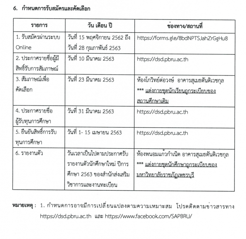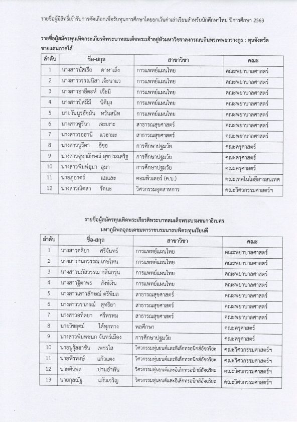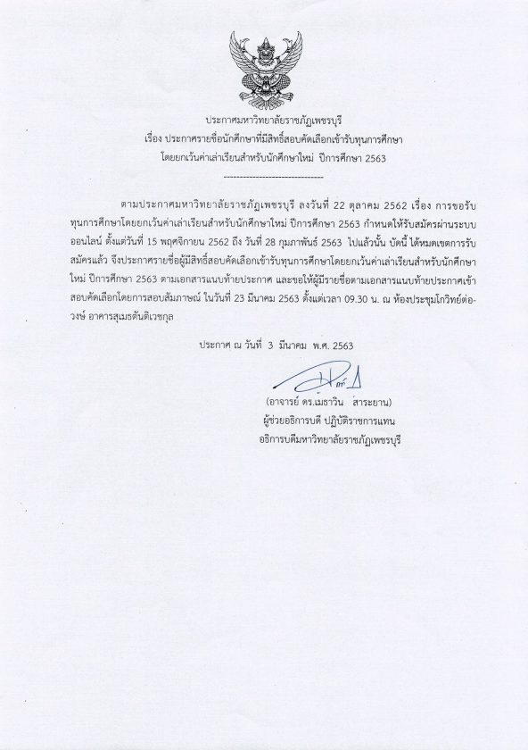ตามประกาศมหาวิทยาลัยราชภัฏเพชรบุรี ลงวันที่ 22 ตุลาคม 2562 เรื่อง การขอรับทุนการศึกษาโดยยกเว้นค่าเล่าเรียนสำหรับนักศึกษาใหม่ ปีการศึกษา 2563 กำหนดให้รับสมัครผ่านระบบออนไลน์ ตั้งแต่วันที่ 15 พฤศจิกายน 2562 ถึง วันที่ 28 กุมภาพันธ์ 2563 ไปแล้วนั้น บัดนี้ ได้หมดเขตการรับสมัครแล้ว จึงประกาศรายชื่อผู้มีสิทธิ์สอบคัดเลือกเข้ารับทุนการศึกษาโดยยกเว้นค่าเล่าเรียนสำหรับนักศึกษาใหม่ ปีการศึกษา 2563 ตามเอกสารแนบท้ายประกาศ และขอให้ผู้มีรายชื่อตามเอกสารแนบท้ายประกาศเข้าสอบคัดเลือกโดยสอบสัมภาษณ์ ในวันที่ 23 มีนาคม 2563 ตั้งแต่เวลา 09.30 น. ณ ห้องโกวิทย์ต่อวงษ์ อาคารสุเมธตันติเวชกุล