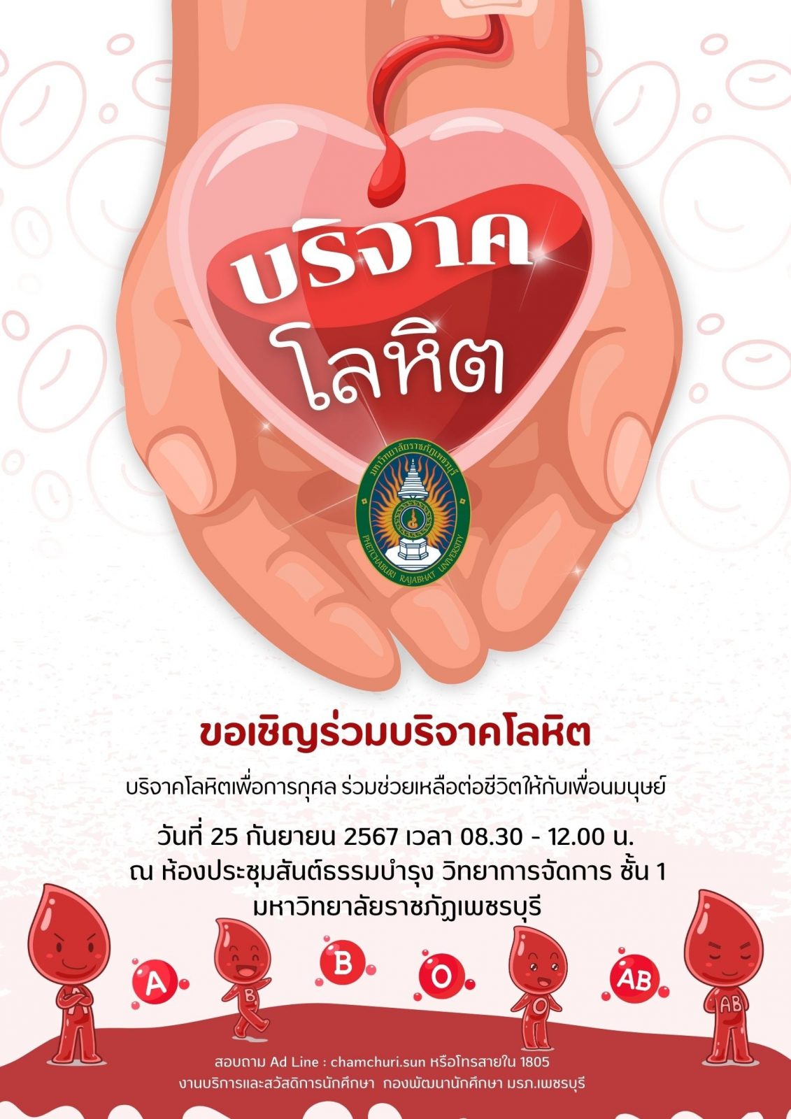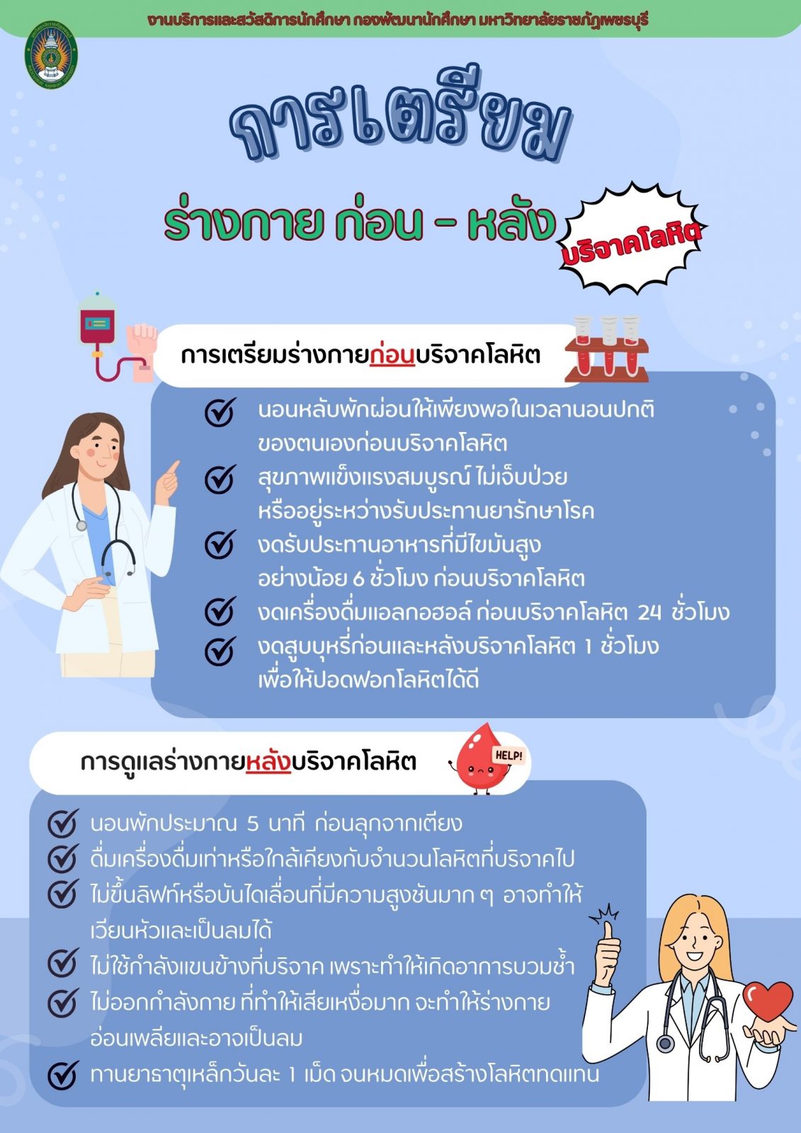 ขอเชิญทุกท่านร่วมบริจาคโลหิต 🩸🩸 ในวันที่ 25 กันยายน 2567 23 กันยายน 202424 กันยายน 2024AdminNongข่าวสื่อสารองค์กร จำนวนผู้ชม : 16 เชิญทุกท่านร่วมบริจาคโลหิต ในวันที่ 25 กันยายน 2567 กองพัฒนานักศึกษา มหาวิทยาลัยราชภัฏเพชรบุรี ได้กำหนดจัดกิจกรรมรับบริจาคโลหิต ในวันพุธที่ 25 กันยายน 2567 เวลา 8.30 - 12.00 น. ณ ห้องประชุมสันต์ธรรมบำรุง คณะวิทยาการจัดาการ ชั้น 1 "เพื่อต่อชีวิตเพื่อนมนุษย์และมอบความรัก ให้ความสุขผ่านเลือดทุกกรุ๊ปของพวกเรา" การเตรียมความพร้อมก่อนบริจาคโลหิต ดังนี้มีสุขภาพแข็งแรง หากมียาที่รับประทานเป็นประจำให้แจ้ง เจ้าหน้าที่คัดกรองทราบทุกครั้ง นอนหลับพักผ่อนให้เพียงพอ สวมใส่เสื้อผ้าสบาย ไม่คับจนเกินไป รับประทานอาหารที่มีธาตุเหล็กสูงก่อนบริจาคโลหิตและหลีกเลี่ยงอาหารที่มีไขมันสูง งดสูบบุหรี่ก่อนและหลังบริจาคโลหิต ไ ชม. งดดื่มเครื่องดื่มแอลกอฮอล์อย่างน้อย 24 ชม.ก่อนบริจาคโลหิต ดื่มน้ำอย่างน้อย 3-4 แก้ว ก่อนบริจาคโลหิต ต้องมีน้ำหนักตัวตั้งแต่ 45 กิโลกรัมขึ้น.... ติดต่อสอบถามรายละเอียดเพิ่มเติมได้ที่ 032-708610 Phetchaburi670923-1 Facebook iconFacebookTwitter iconTwitterLINE iconLine
