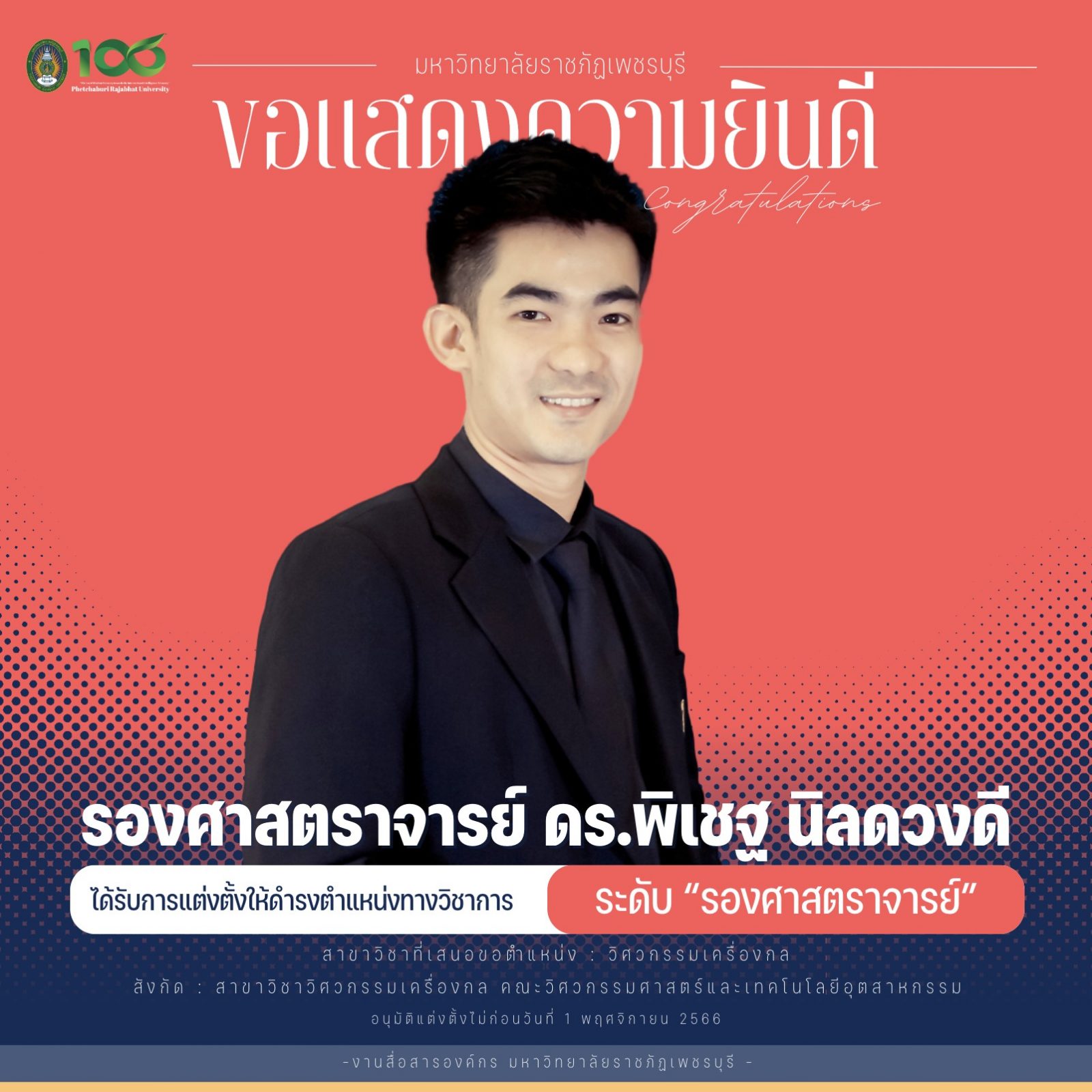 ขอแสดงความยินดีกับรองศาสตราจารย์ ดร.พิเชฐ นิลดวงดี ในโอกาสได้รับการแต่งตั้งให้ดำรงตำแหน่งทางวิชาการระดับ ” รองศาสตราจารย์” 24 พฤศจิกายน 202424 พฤศจิกายน 2024piyanunข่าวประชาสัมพันธ์, ข่าวสำหรับบุคลากร, ข่าวสื่อสารองค์กร จำนวนผู้ชม : 57 มหาวิทยาลัยราชภัฏเพชรบุรี ขอแสดงความยินดีกับ รองศาสตราจารย์ ดร.พิเชฐ นิลดวงดี ในโอกาสได้รับการแต่งตั้งให้ดำรงตำแหน่งทางวิชาการ ระดับ ” รองศาสตราจารย์” สาขาวิชาที่เสนอขอตำแหน่ง : วิศวกรรมเครื่องกลสังกัด : สาขาวิชาวิศวกรรมเครื่องกลคณะวิศวกรรมศาสตร์และเทคโนโลยีอุตสาหกรรมอนุมัติแต่งตั้งไม่ก่อนวันที่ 1 พฤศจิกายน 2566 Facebook iconFacebookTwitter iconTwitterLINE iconLine