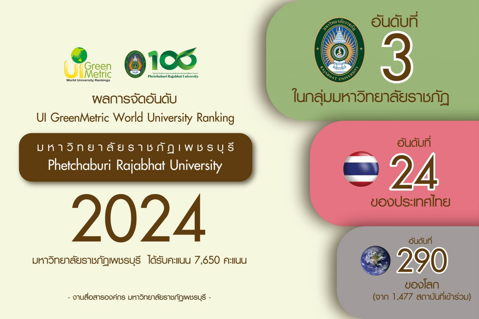 ผลการจัดอันดับ UI GreenMetric World University Ranking 2024 16 ธันวาคม 202416 ธันวาคม 2024piyanunข่าวประชาสัมพันธ์, ข่าวสำหรับบุคลากร, ข่าวสื่อสารองค์กร จำนวนผู้ชม : 75 ผลการจัดอันดับ UI GreenMetric World University Ranking 2024 ผลการจัดอันดับ UI GreenMetric World University Ranking 2024 มหาวิทยาลัยราชภัฏเพชรบุรี ได้รับคะแนน 7,650 คะแนน อันดับที่ 3 กลุ่มมหาวิทยาลัยราชภัฏ อันดับที่ 24 ของประเทศไทย อันดับที่ 290 ของโลก จาก 1,477 สถาบันที่เข้าร่วม UI GreenMetric World University Rankings เป็นการจัดอันดับที่ให้ความสำคัญกับความยั่งยืนในมหาวิทยาลัย โดยประเมินความพยายามของสถาบันการศึกษาทั่วโลกในการส่งเสริมและรักษาสิ่งแวดล้อมตามตัวชี้วัด 6 ด้านสำคัญ ซึ่งแต่ละด้านเป็นเสาหลักที่ขับเคลื่อนมหาวิทยาลัยสู่ความยั่งยืนอย่างแท้จริง ได้แก่ การจัดการสภาพแวดล้อมและโครงสร้างพื้นฐาน การใช้พลังงานและการเปลี่ยนแปลงสภาพภูมิอากาศ การจัดการของเสีย การบริหารจัดการน้ำ การจัดการระบบการขนส่ง การศึกษาและการวิจัย ติดตามความเคลื่อนไหวของมหาวิทยาลัยราชภัฏเพชรบุรีได้ที่Website: www.pbru.ac.thFacebook: มหาวิทยาลัยราชภัฏเพชรบุรี งานสื่อสารองค์กร https://www.facebook.com/prpbruYoutube: (Pbru Channel) https://www.youtube.com/@PBRUChannelTikTok: (pbruofficial) https://www.tiktok.com/@pbruofficial?_t=8rsFgH6g8fA&_r=1IG: (pbru_official) https://www.instagram.com/pbru_official?igsh=MWsweGN2YXc4em5oOA==Twitter: (pbruofficial) https://x.com/pbruofficial?s=21 Facebook iconFacebookTwitter iconTwitterLINE iconLine