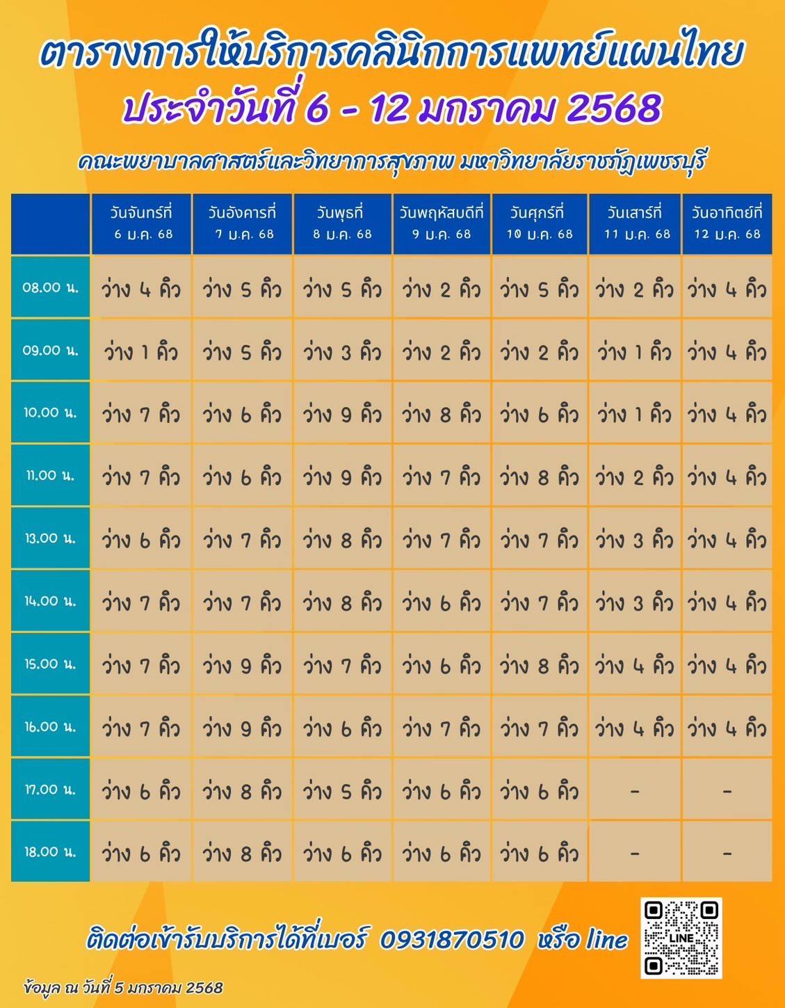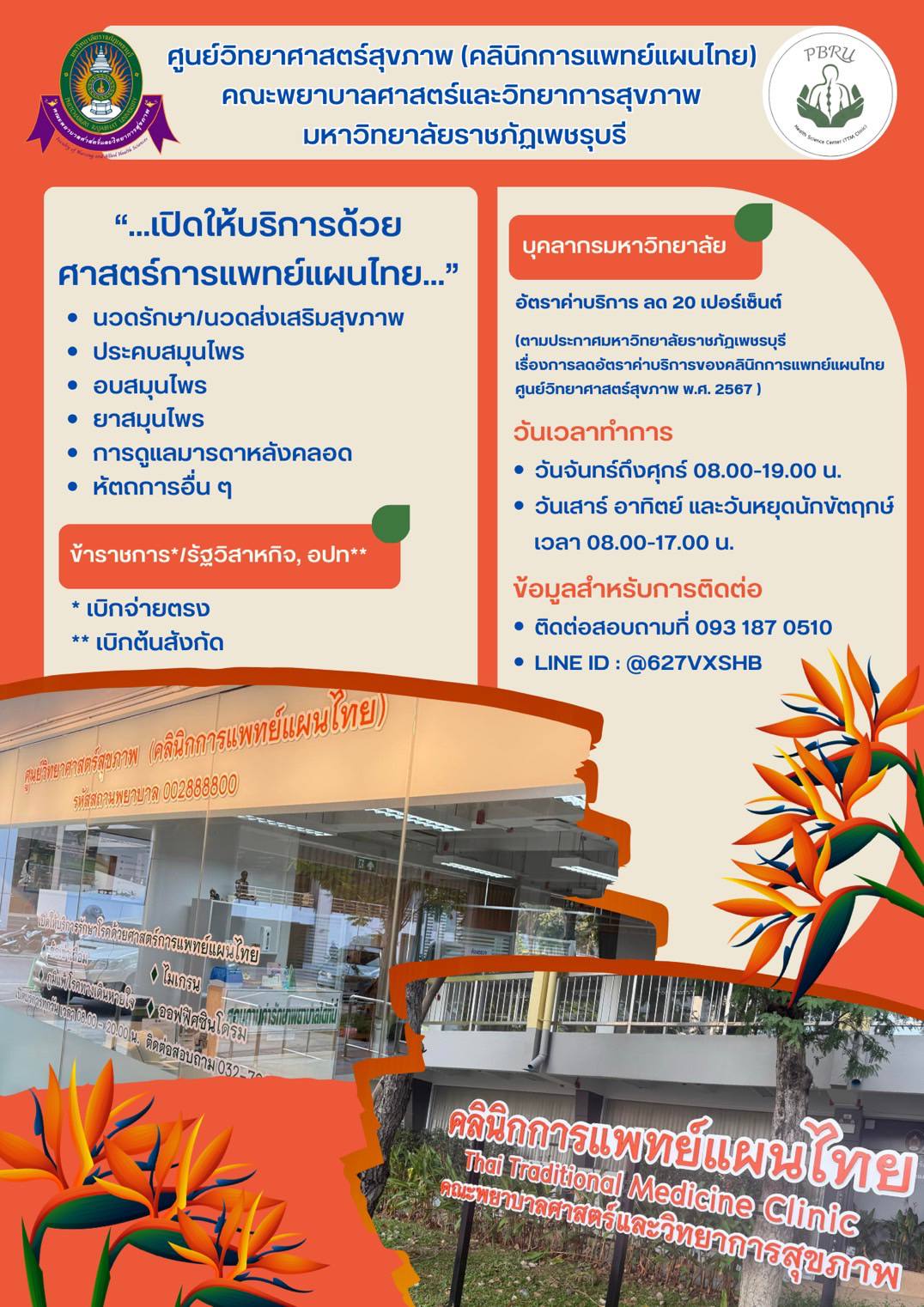 ศูนย์วิทยาศาสตร์สุขภาพ (คลินิกการแพทย์แผนไทย) คณะพยาบาลศาสตร์และวิทยาการสุขภาพ 6 มกราคม 20256 มกราคม 2025piyanunข่าวประชาสัมพันธ์, ข่าวสำหรับบุคลากร, ข่าวสื่อสารองค์กร จำนวนผู้ชม : 42 ศูนย์วิทยาศาสตร์สุขภาพ (คลินิกการแพทย์แผนไทย)คณะพยาบาลศาสตร์และวิทยาการสุขภาพ ติดตามความเคลื่อนไหวของมหาวิทยาลัยราชภัฏเพชรบุรีได้ที่Website: www.pbru.ac.thFacebook: มหาวิทยาลัยราชภัฏเพชรบุรี งานสื่อสารองค์กร https://www.facebook.com/prpbruYoutube: (Pbru Channel) https://www.youtube.com/@PBRUChannelTikTok: (pbruofficial) https://www.tiktok.com/@pbruofficial?_t=8rsFgH6g8fA&_r=1IG: (pbru_official) https://www.instagram.com/pbru_official?igsh=MWsweGN2YXc4em5oOA==Twitter: (pbruofficial) https://x.com/pbruofficial?s=21Tel: 0 3270 8612 (กลุ่มงานสื่อสารองค์กร) Facebook iconFacebookTwitter iconTwitterLINE iconLine