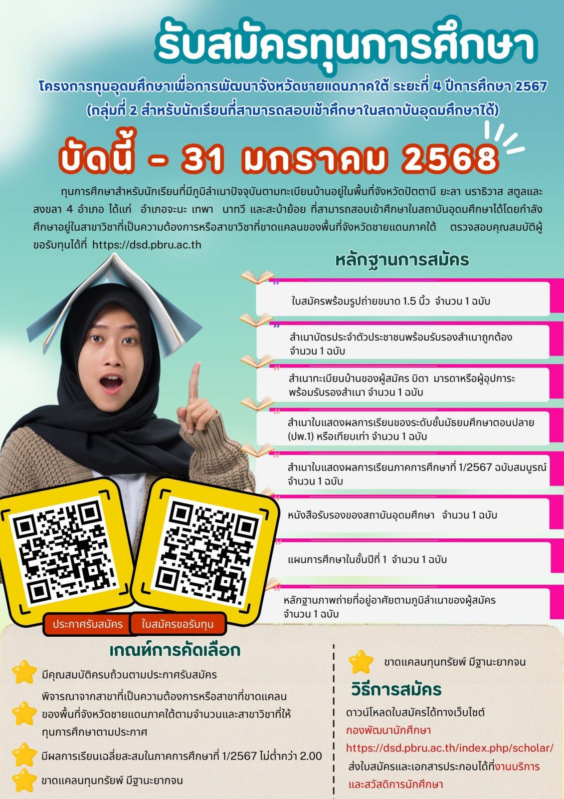 รับสมัครนักศึกษาทุนการศึกษาโครงการทุนอุดมศึกษาเพื่อการพัฒนาจังหวัดชายแดนภาคใต้ปีการศึกษา 2567 8 มกราคม 202511 เมษายน 2025piyanunข่าวประชาสัมพันธ์, ข่าวสำหรับนักศึกษา, ข่าวสื่อสารองค์กร, ทุนการศึกษา จำนวนผู้ชม : 19 รับสมัครนักศึกษาทุนการศึกษาโครงการทุนอุดมศึกษาเพื่อการพัฒนาจังหวัดชายแดนภาคใต้ปีการศึกษา 2567 อ่านรายละเอียดเพิ่มเติมได้ที่ https://dsd.pbru.ac.th/index.php/scholar/ ติดตามความเคลื่อนไหวของมหาวิทยาลัยราชภัฏเพชรบุรีได้ที่Website: www.pbru.ac.thFacebook: มหาวิทยาลัยราชภัฏเพชรบุรี งานสื่อสารองค์กร https://www.facebook.com/prpbruYoutube: (Pbru Channel) https://www.youtube.com/@PBRUChannelTikTok: (pbruofficial) https://www.tiktok.com/@pbruofficial?_t=8rsFgH6g8fA&_r=1IG: (pbru_official) https://www.instagram.com/pbru_official?igsh=MWsweGN2YXc4em5oOA==Twitter: (pbruofficial) https://x.com/pbruofficial?s=21Tel: 0 3270 8612 (กลุ่มงานสื่อสารองค์กร) Facebook iconFacebookTwitter iconTwitterLINE iconLine