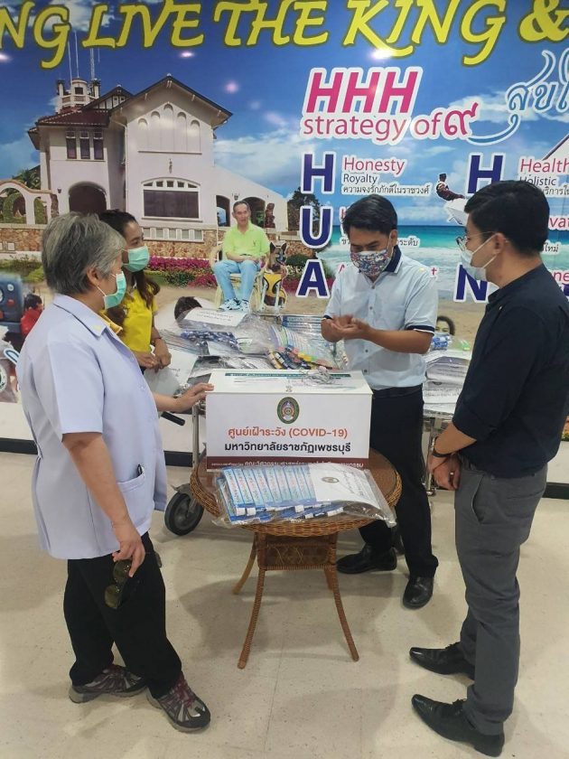 ขณะที่ศูนย์บริหารสถานการณ์ณ์การแพร่ระบาดของโรคติดเชื้อโคโรนา 2019 ซึ่งตั้งอยู่ภายในมหาวิทยาลัยราชภัฏเพชรบุรี ได้มีองค์กรปกครองส่วนท้องถิ่นและโรงพยาบาลส่งเสริมสุขภาพตำบลเข้ามาขอรับการสนับสนุน หน้ากากป้องกันใบหน้า (face shield) อย่างต่อเนื่อง เพื่อนำไปมอบให้กับเจ้าหน้าที่โรงพยาบาลส่งเสริมสุขภาพตำบล ตลอดจนกลุ่ม อสม. ซึ่งเป็นกลุ่มที่ลงพื้นที่พบปะประชาชนเพื่อตรวจสุขภาพและให้ข้อมูลในการป้องกันไวรัสโควิด-19 ที่กำลังแพร่ระบาดอยู่ในขณะนี้