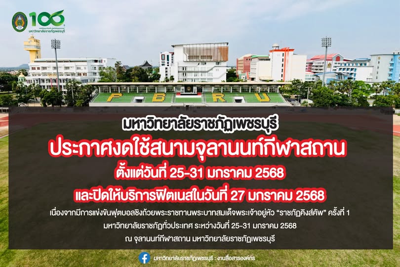 ประกาศงดใช้สนามจุลานนท์กีฬาสถาน มหาวิทยาลัยราชภัฏเพชรบุรี 24 มกราคม 202524 มกราคม 2025piyanunข่าวประชาสัมพันธ์, ข่าวสำหรับบุคลากร, ข่าวสื่อสารองค์กร จำนวนผู้ชม : 56 ประกาศงดใช้สนามจุลานนท์กีฬาสถาน มหาวิทยาลัยราชภัฏเพชรบุรี มหาวิทยาลัยราชภัฏเพชรบุรีประกาศงดใช้สนามจุลานนท์กีฬาสถาน มหาวิทยาลัยราชภัฏเพชรบุรีตั้งแต่วันที่ 25-31 มกราคม 2568และปิดให้บริการฟิตเนสในวันที่ 27 มกราคม 2568เนื่องจากมีการแข่งขันฟุตบอลชิงถ้วยพระราชทานพระบาทสมเด็จพระเจ้าอยู่หัว “ราชภัฏคิงส์คัพ” ครั้งที่ 1 มหาวิทยาลัยราชภัฏทั่วประเทศระหว่างวันที่ 25-31 มกราคม 2568ณ จุลานนท์กีฬาสถาน มหาวิทยาลัยราชภัฏเพชรบุรี ติดตามความเคลื่อนไหวของมหาวิทยาลัยราชภัฏเพชรบุรีได้ที่Website: www.pbru.ac.thFacebook: มหาวิทยาลัยราชภัฏเพชรบุรี งานสื่อสารองค์กร https://www.facebook.com/prpbruYoutube: (Pbru Channel) https://www.youtube.com/@PBRUChannelTikTok: (pbruofficial) https://www.tiktok.com/@pbruofficial?_t=8rsFgH6g8fA&_r=1IG: (pbru_official) https://www.instagram.com/pbru_official?igsh=MWsweGN2YXc4em5oOA==Twitter: (pbruofficial) https://x.com/pbruofficial?s=21Tel: 0 3270 8612 (กลุ่มงานสื่อสารองค์กร) Facebook iconFacebookTwitter iconTwitterLINE iconLine