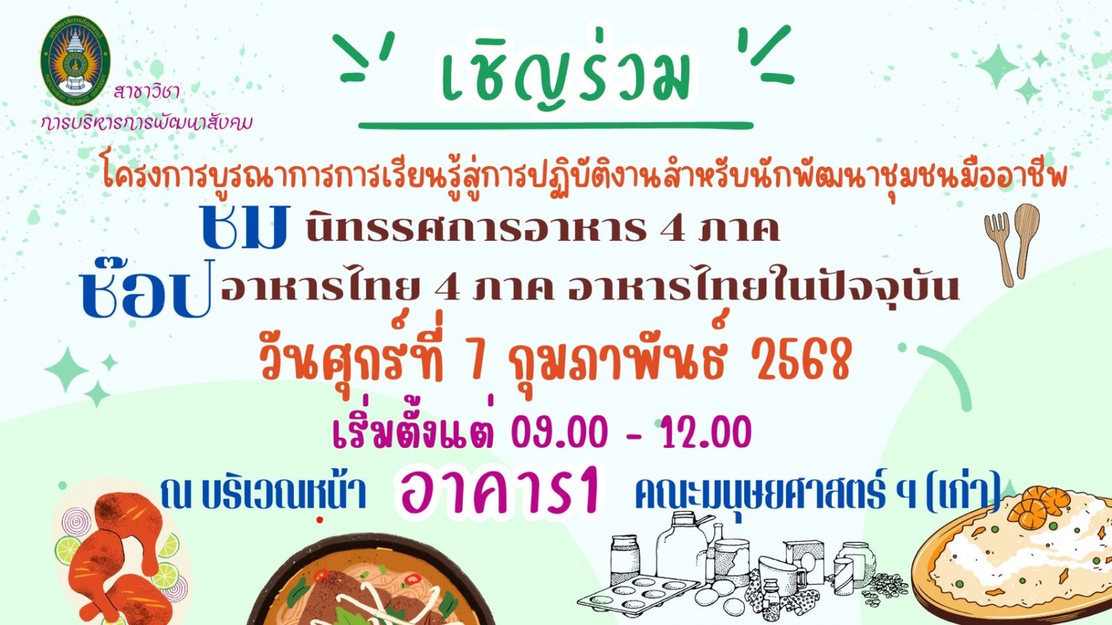 ขอเชิญร่วมงานโครงการบูรณาการเรียนรู้สู่การปฏิบัติงาน สำหรับนักพัฒนาชุมชนมืออาชีพ 4 กุมภาพันธ์ 20254 กุมภาพันธ์ 2025piyanunข่าวประชาสัมพันธ์, ข่าวสำหรับบุคลากร, ข่าวสื่อสารองค์กร จำนวนผู้ชม : 12 ขอเชิญร่วมงานโครงการบูรณาการเรียนรู้สู่การปฏิบัติงาน สำหรับนักพัฒนาชุมชนมืออาชีพ ขอเชิญร่วมงานโครงการบูรณาการเรียนรู้สู่การปฏิบัติงานสำหรับนักพัฒนาชุมชนมืออาชีพ ชมนิทรรศการอาหาร 4 ภาค ช๊อปอาหารไทย 4 ภาค อาหารไทยในปัจจุบันในวันศุกร์ที่ 7 กุมภาพันธ์ 2568ตั้งแต่เวลา 09.00 น.- 12.00 น.ณ บริเวณหน้าอาคาร 1 คณะมนุษยศาสตร์ฯ(เก่า) Facebook iconFacebookTwitter iconTwitterLINE iconLine