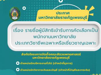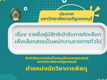 ประกาศมหาวิทยาลัยราชภัฏเพชรบุรี เรื่อง รายชื่อผู้มีสิทธิเข้ารับการคัดเลือกเพื่อเลือกสรรเป็นพนักงานราชการทั่วไป สังกัดโครงการจัดตั้งคณะสัตวแพทยศาสตร์ มหาวิทยาลัยราชภัฏเพชรบุรี ตำแหน่งนักวิชาการพัสดุ