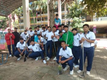 นักศึกษาสาขาวิชาพลศึกษาชั้นปีที่ 1 ห้อง 6841 – 89/1 และห้อง 6841 – 89/2 ที่เรียนในรายวิชา จิตวิญญาณความเป็นครู มีจิตอาสาด้วยการมาช่วยทำสวนดอกไม้และกวาดใบไม้