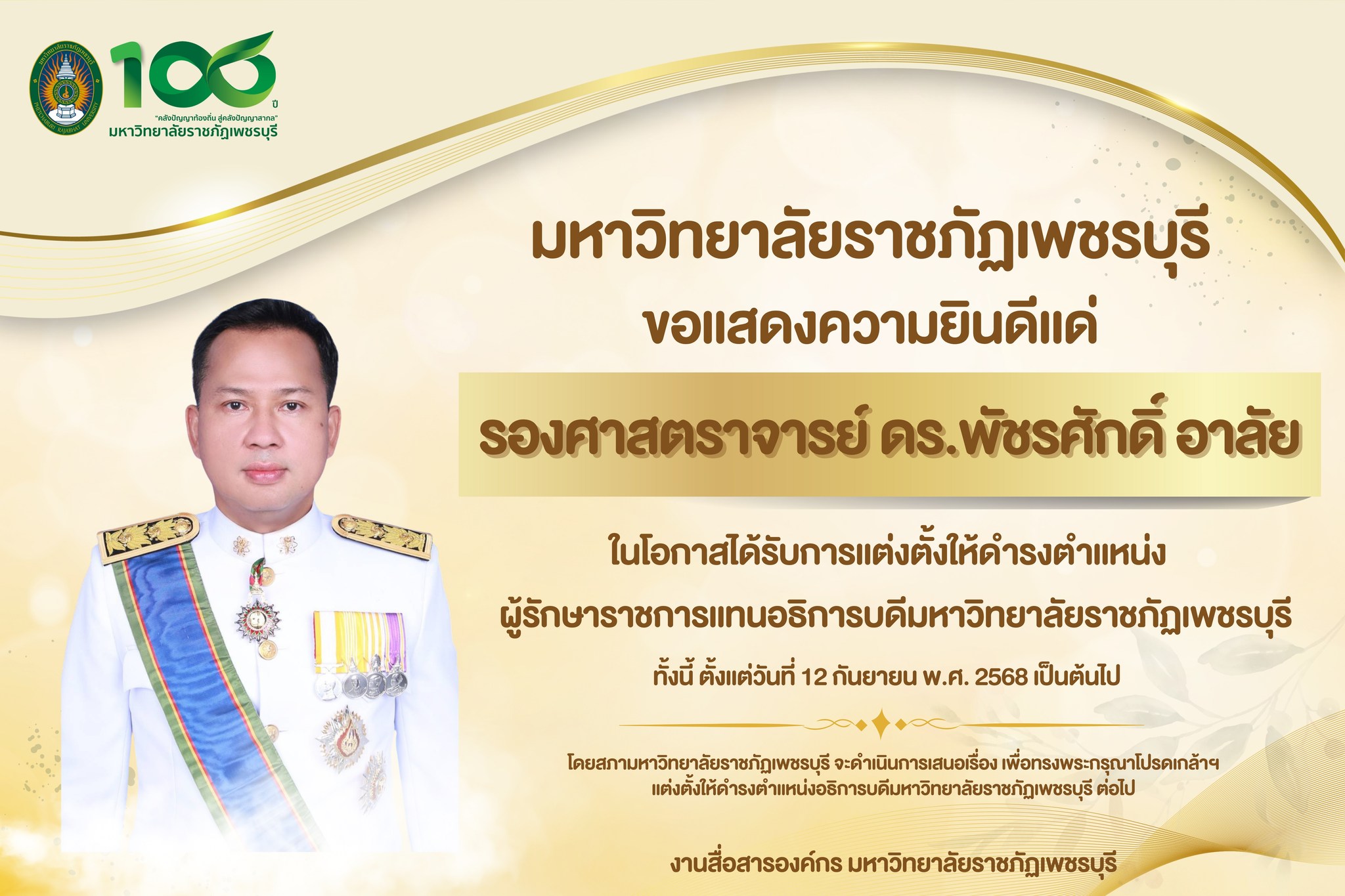 ขอแสดงความยินดีกับรองศาสตราจารย์ ดร.พัชรศักดิ์ อาลัย ในโอกาสได้รับการแต่งตั้งให้ดำรงตำแหน่ง “ ผู้รักษาราชการแทนอธิการบดีมหาวิทยาลัยราชภัฏเพชรบุรี ”