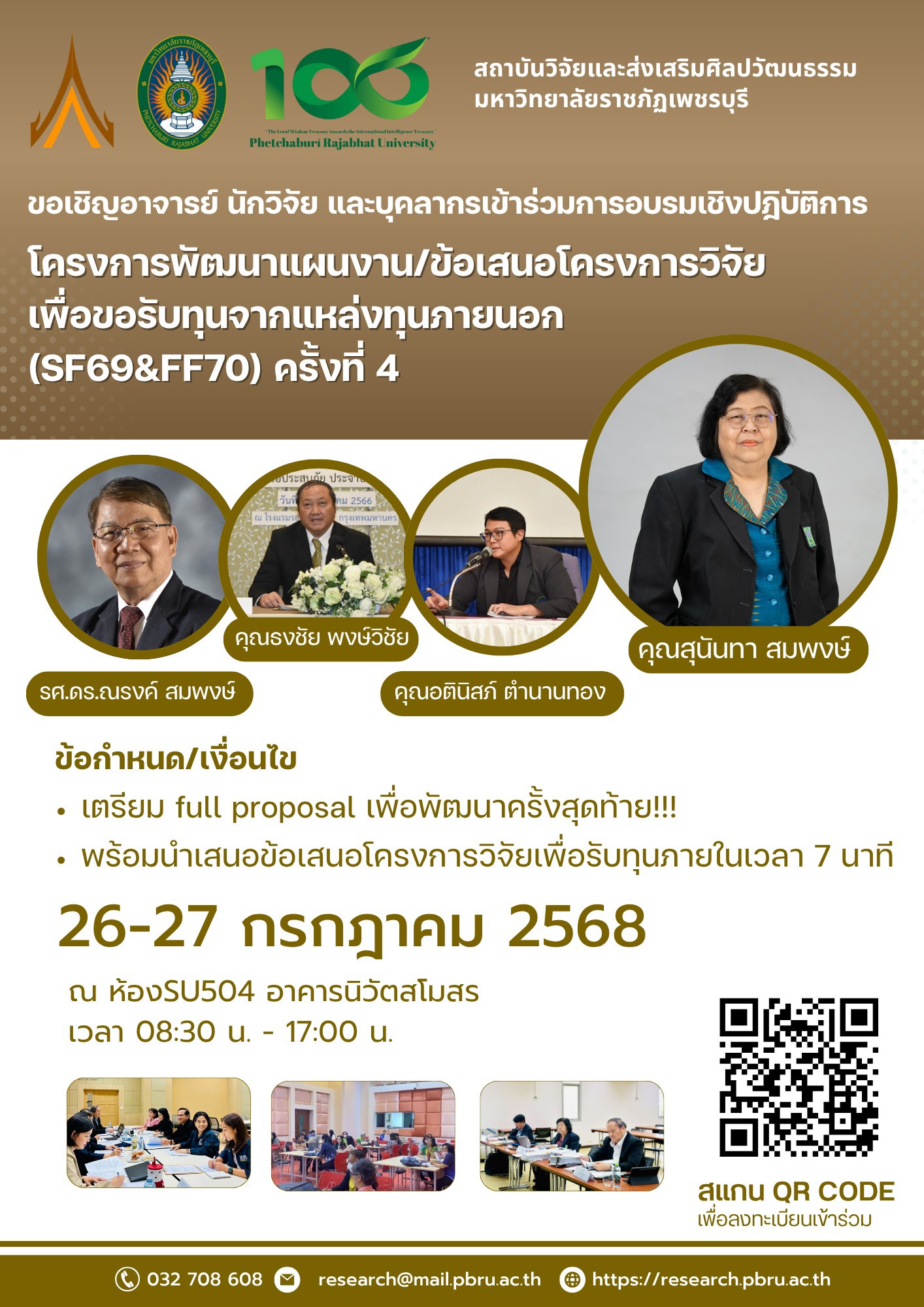 ประชาสัมพันธ์เปิดรับสมัครเข้าร่วมอบรมพัฒนาข้อเสนอโครงการวิจัย เพื่อขอรับทุนสนับสนุนการวิจัย (SF2569&FF2570) ระยะที่ 4