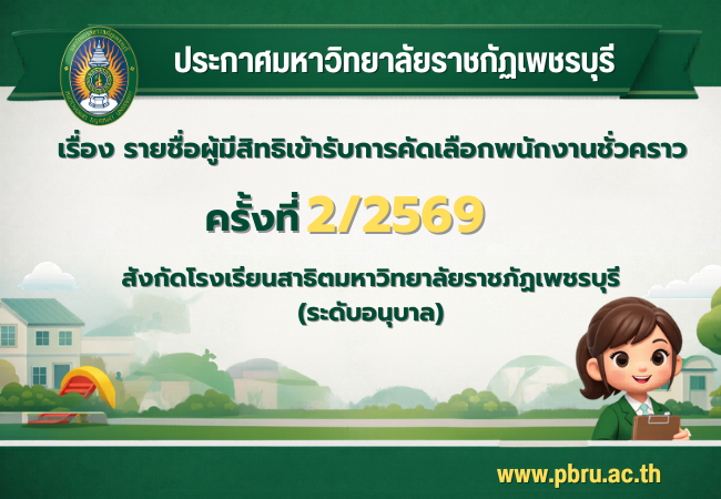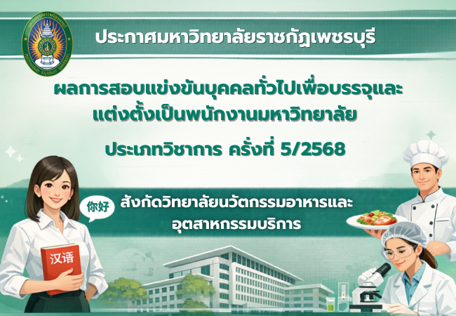 ข่าวรับสมัครงาน ข่าวรับสมัครงาน ทั้งหมด All ประกาศผลสอบ ประกาศรับสมัคร ประกาศรายชื่อผู้มีสิทธิ์สอบ ผลการสอบแข่งขันบุคคลทั่วไปเพื่อบรรจุและแต่งตั้งเป็นพนักงานมหาวิทยาลัย ประเภทวิชาการ ครั้งที่ 5/2568 สังกัดวิทยาลัยนวัตกรรมอาหารและอุตสาหกรรมบริการ 27 มีนาคม 2026 รายชื่อผู้มีสิทธิเข้ารับการคัดเลือกลูกจ้างชาวต่างประเทศ สังกัดโรงเรียนสาธิตมหาวิทยาลัยราชภัฏเพชรบุรี 27 มีนาคม 2026 List of Eligible Candidates for Selection of Foreign Employees (Affiliated with the Demonstration School of Phetchaburi Rajabhat University.) 27 มีนาคม 2026 รายชื่อผู้มีสิทธิเข้ารับการคัดเลือกพนักงานชั่วคราว ครั้งที่ 2/2569 สังกัดโรงเรียนสาธิตมหาวิทยาลัยราชภัฏเพชรบุรี (ระดับอนุบาล) 27 มีนาคม 2026 รายชื่อผู้มีสิทธิเข้ารับการคัดเลือกพนักงานชั่วคราว ครั้งที่ 3/2569 สังกัดคณะพยาบาลศาสตร์และวิทยาการสุขภาพ 27 มีนาคม 2026 ประกาศมหาวิทยาลัยราชภัฏเพชรบุรี เรื่อง ผลการคัดเลือกพนักงานชั่วคราว ครั้งที่ 1/2569 สังกัดกลุ่มงานพัฒนากายภาพ ภูมิสถาปัตย์และสิ่งแวดล้อม สำนักงานอธิการบดี ตำแหน่งพนักงานภาคสนาม 24 มีนาคม 2026 1 2 3 4 5 6 7 8 9 10 11 12 13 14 15 16 17 18 19 20 21 22 23 24 25 26 27 28 29 30 31 32 33 34 35 36 37 38 39 40 41 42 43 44 45 46 47 48 49 50 51 52 53 54 55 56 57 58 59 60 61 62 63 64 65 66 67 68 69 70 71 72 73 74 75 76 77 78 79 80 81 82 83 84 85 86 87 88 89 90 91 92 93 94 95 96 97 98 99 100 101 102 103 104 105 106 107 108 109 110 111 112 113 114 115 116 117 118 119 120 121 122 123 124 125 126 127 128 129 130 131 132 133 134 135 136 Next »