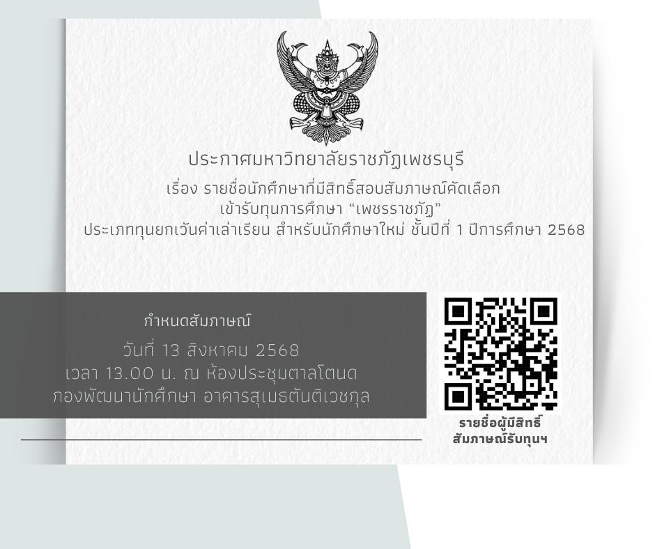 ประกาศรายชื่อนักศึกษาที่มีสิทธิ์สอบสัมภาษณ์คัดเลือกเข้ารับทุนการศึกษา “เพชรราชภัฏ” ประเภททุนยกเว้นค่าเล่าเรียน สำหรับนักศึกษาใหม่ ชั้นปีที่ 1 ปีการศึกษา 2568