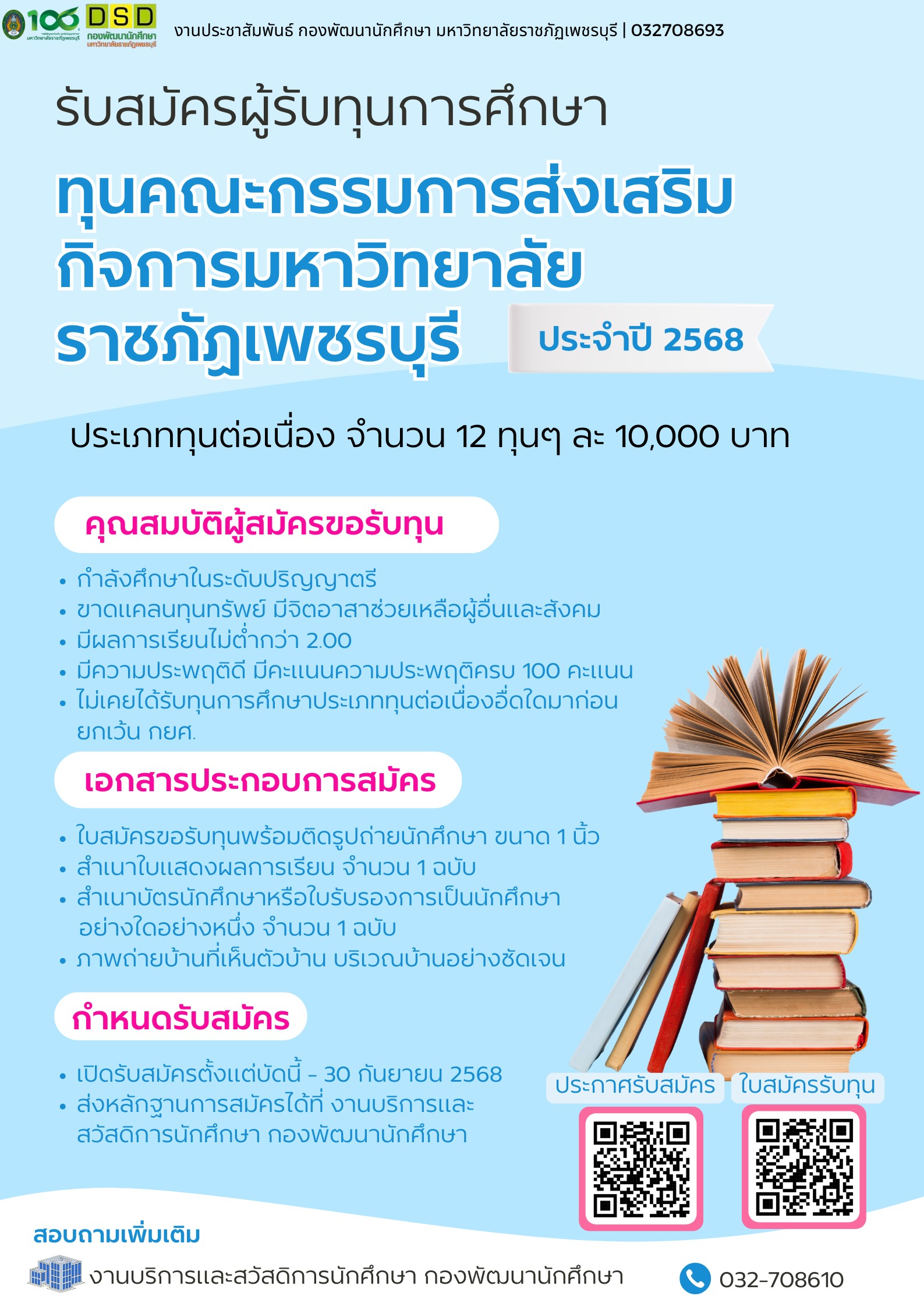 รับสมัครนักศึกษา เพื่อคัดเลือกเข้ารับทุนการศึกษา “คณะกรรมการส่งเสริมกิจการ มหาวิทยาลัยราชภัฏเพชรบุรี” ประเภททุนต่อเนื่อง ประจำปีการศึกษา 2568