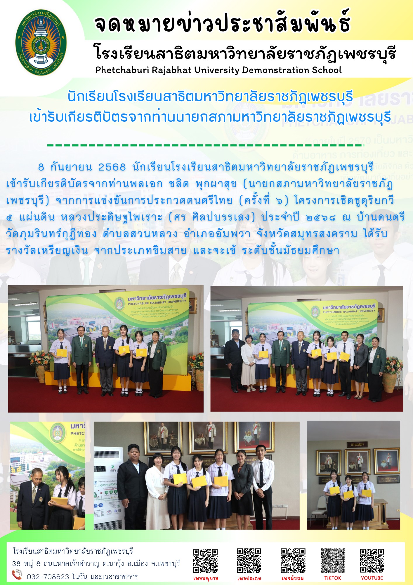 นักเรียนโรงเรียนสาธิตมหาวิทยาลัยราชภัฏเพชรบุรี เข้ารับเกียรติบัตรจากพลเอกชลิต พุกผาสุข นายกสภามหาวิทยาลัยราชภัฏเพชรบุรี